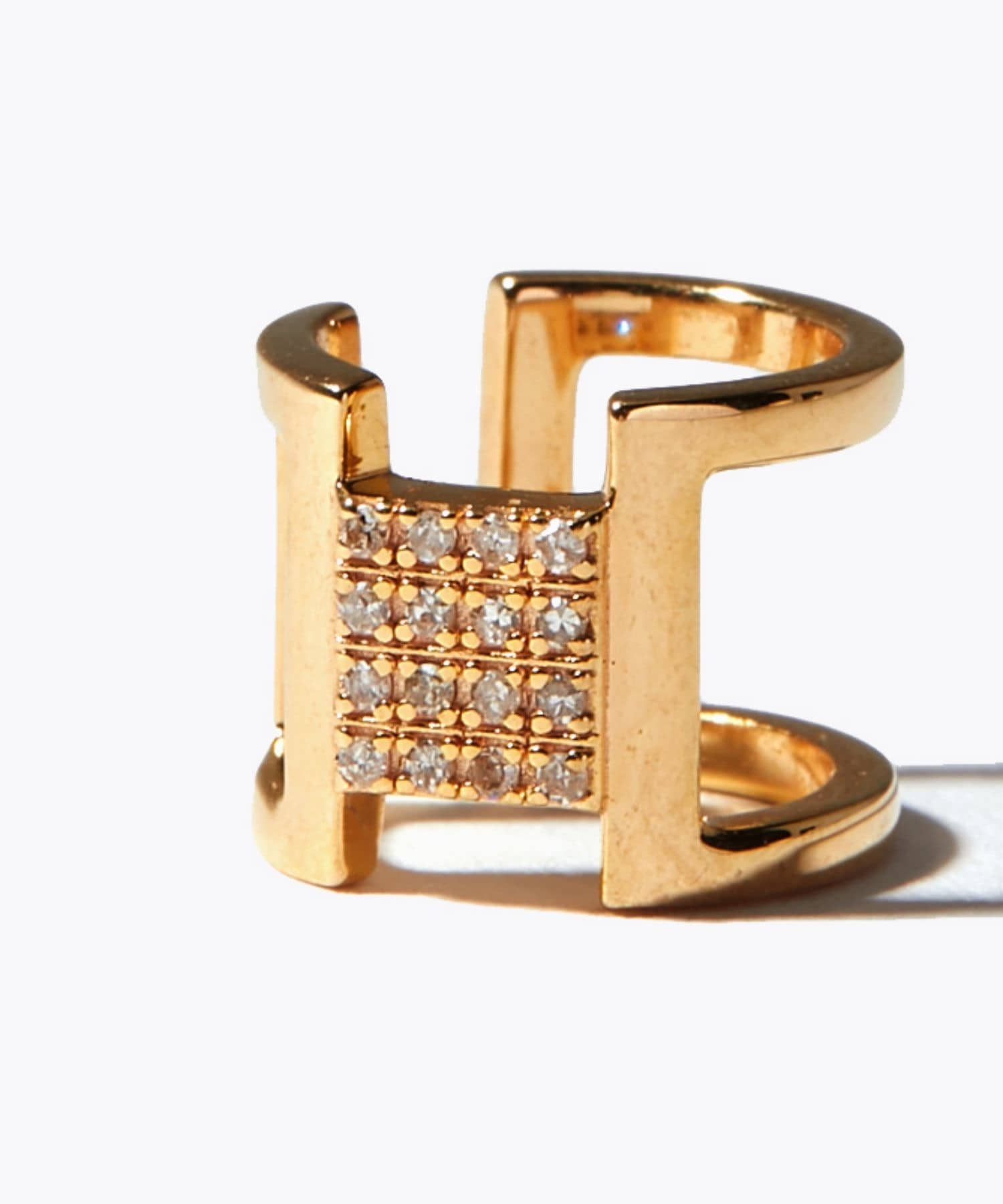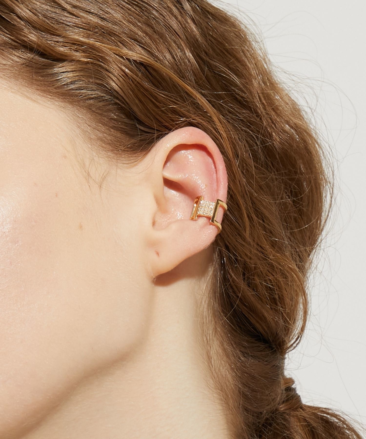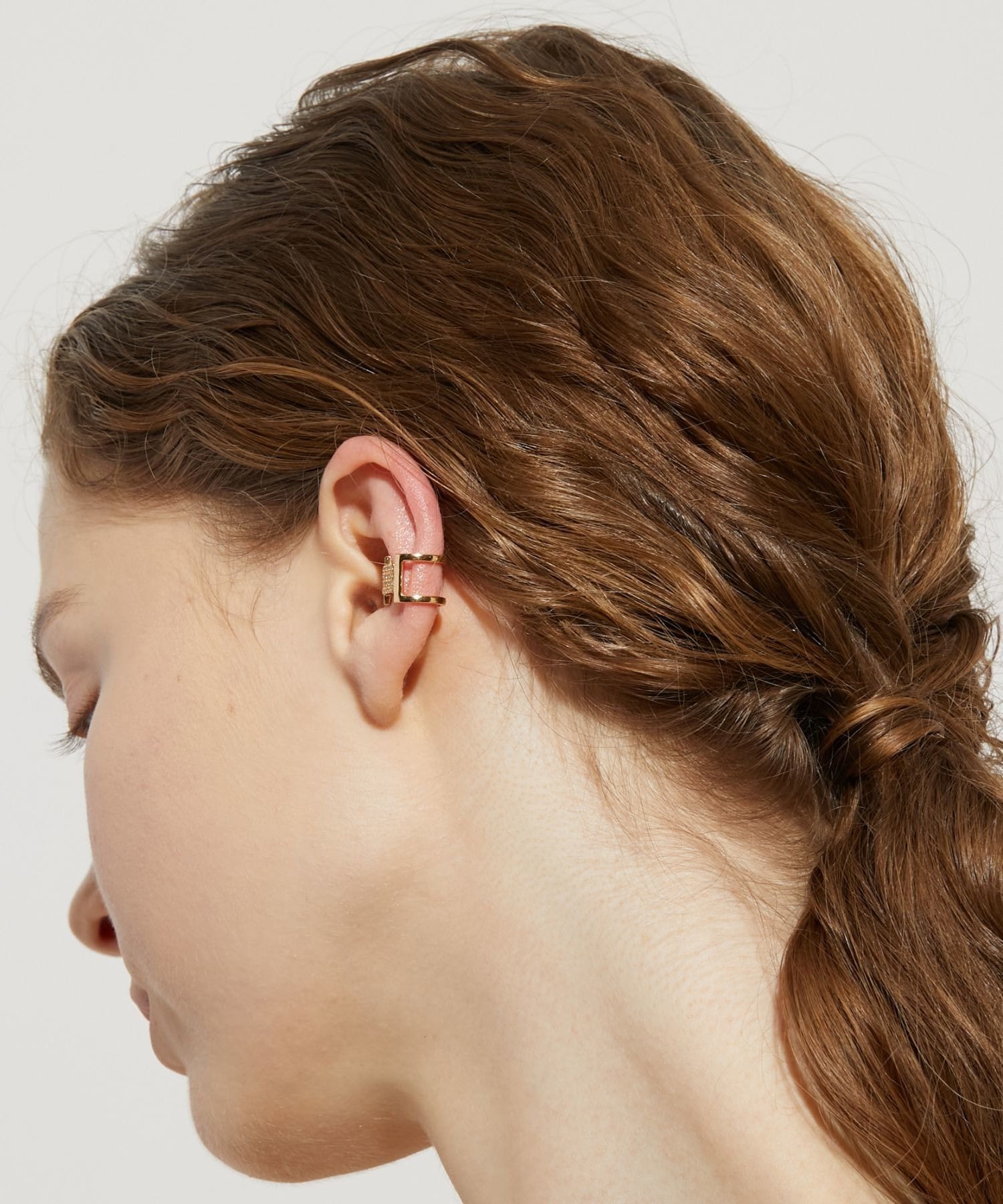 This sophisticated ear cuff offers volume and presence, yet a comfortable fit. The geometric pattern, inspired by the glamorous mood of the 1980s, radiates a brilliant light. The stylish sparkle of the delicate diamonds paved over it makes it an all-in-one fashion accent. A timeless design that combines edge and elegance.