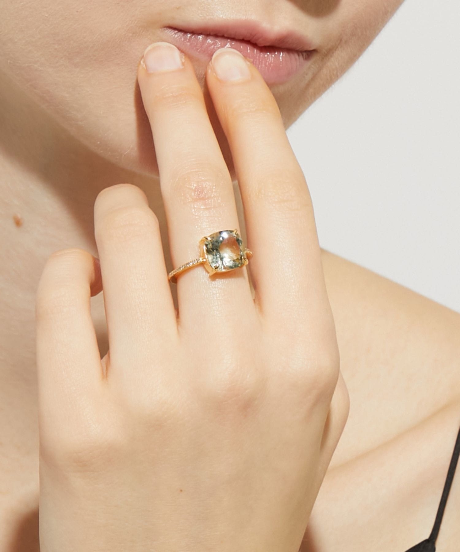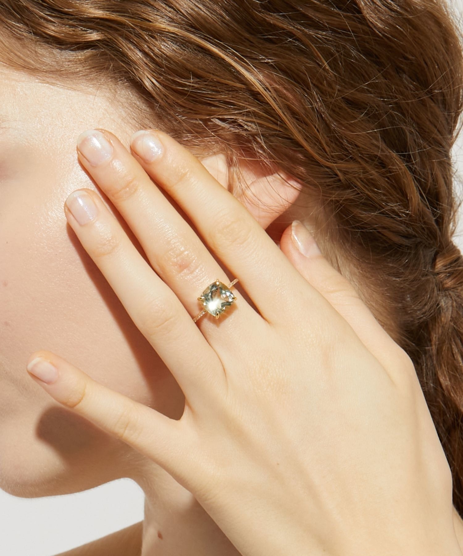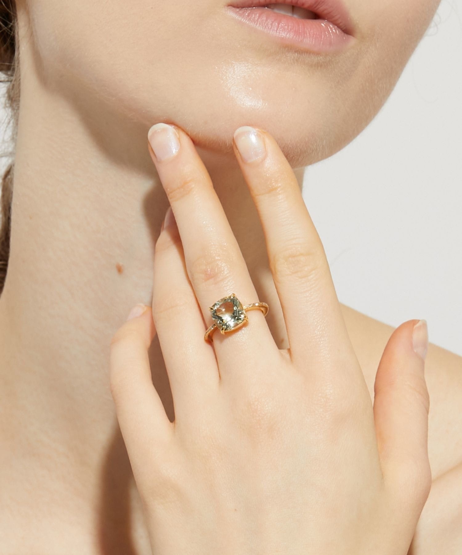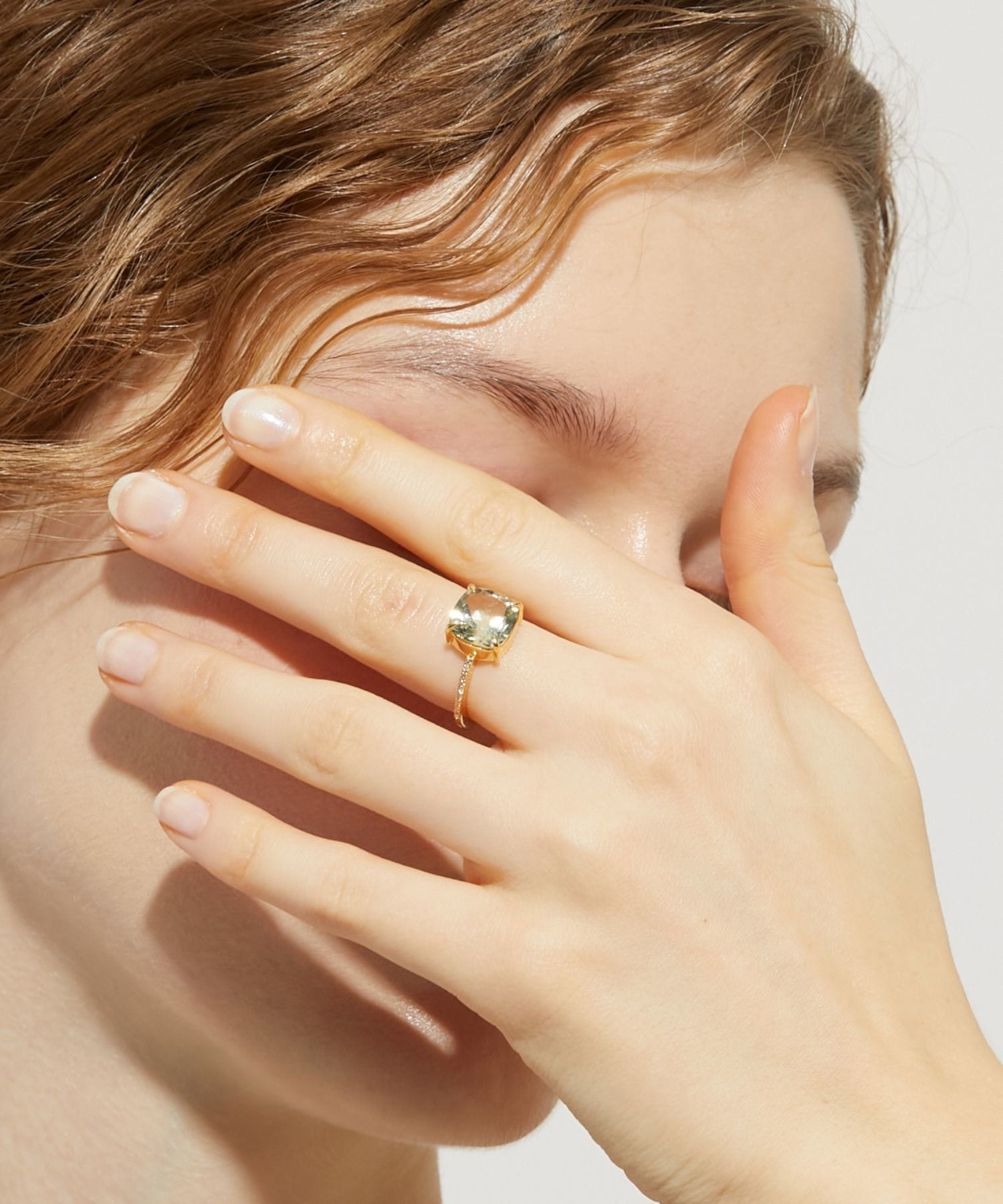 The green amethyst resembles dewdrops dripping from the tip of a leaf. The cushion cut, with its beautiful rounded, soft square shape, is low, making it easy to wear and giving it a modern impression. The half eternity design with a brilliant single-cut diamond is a timeless classic.