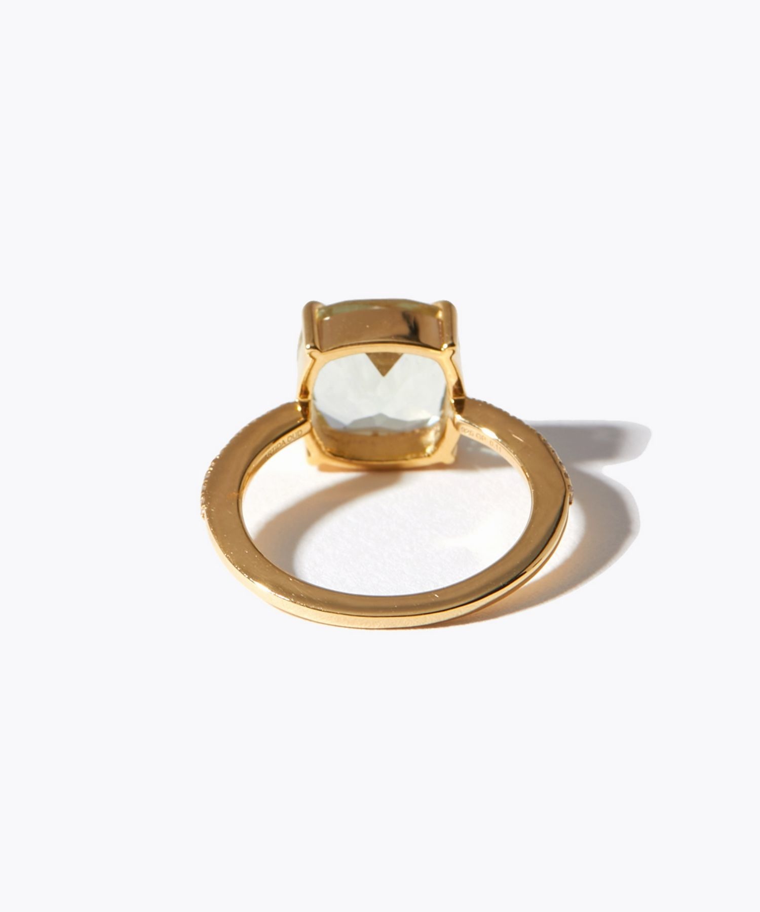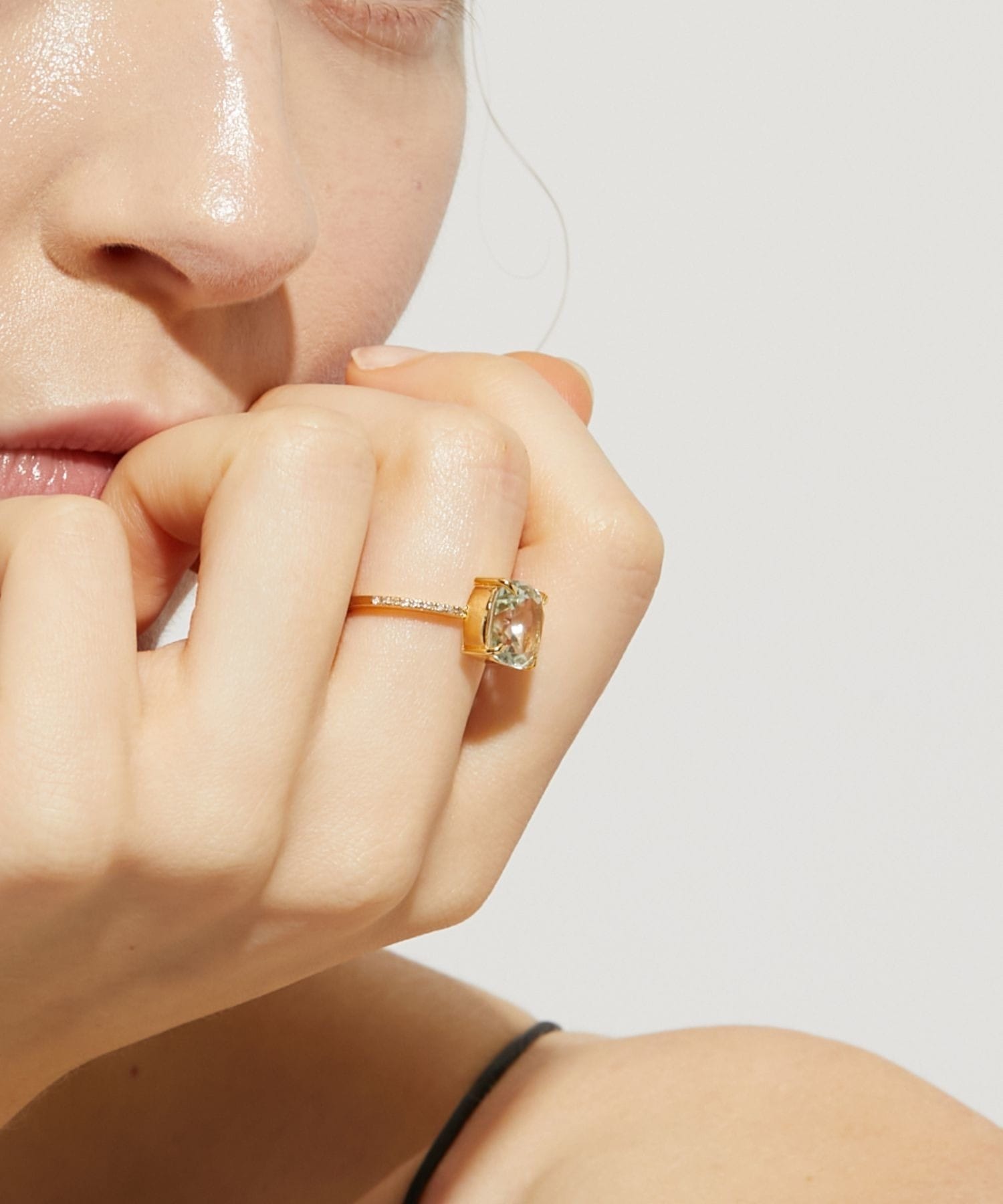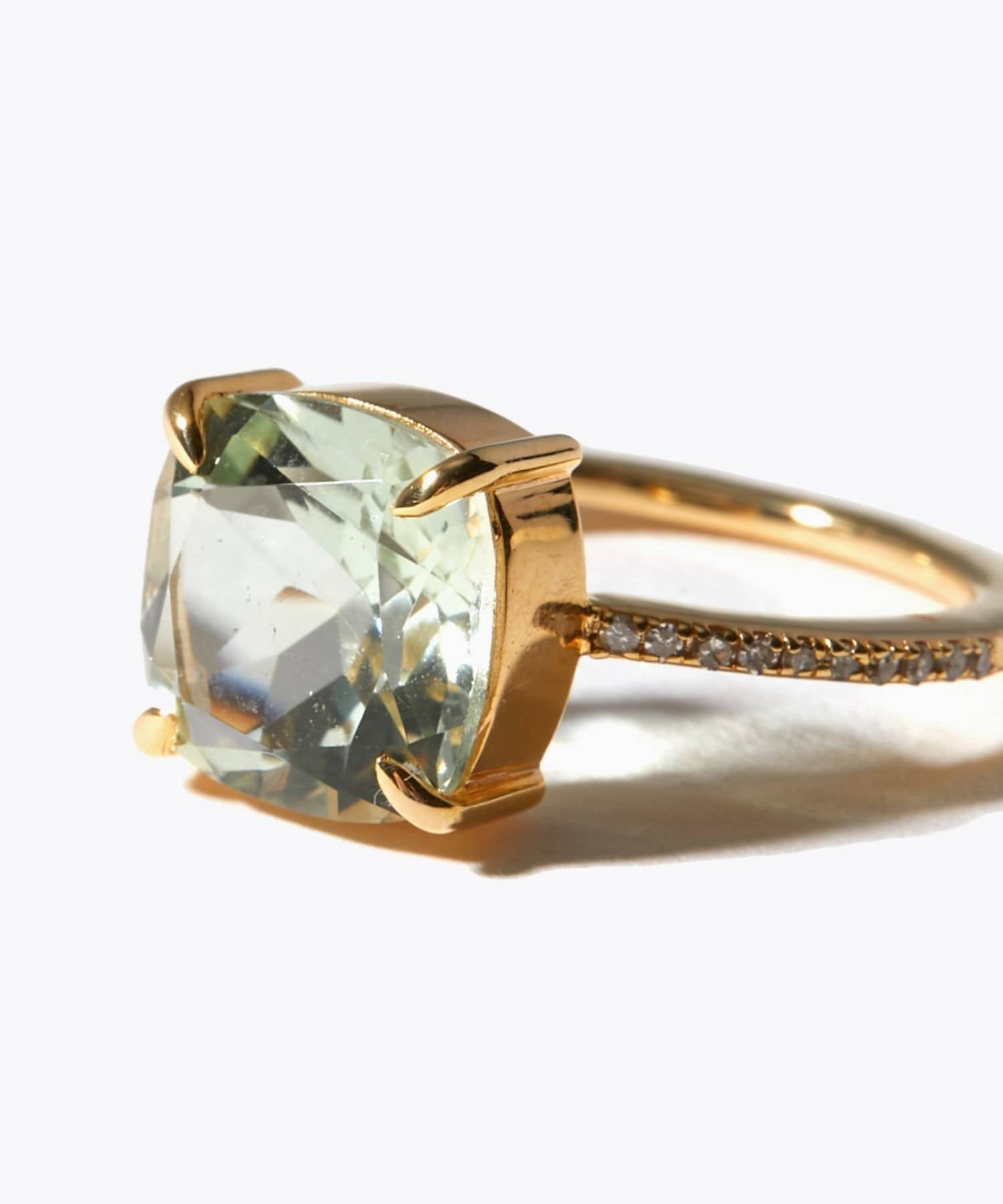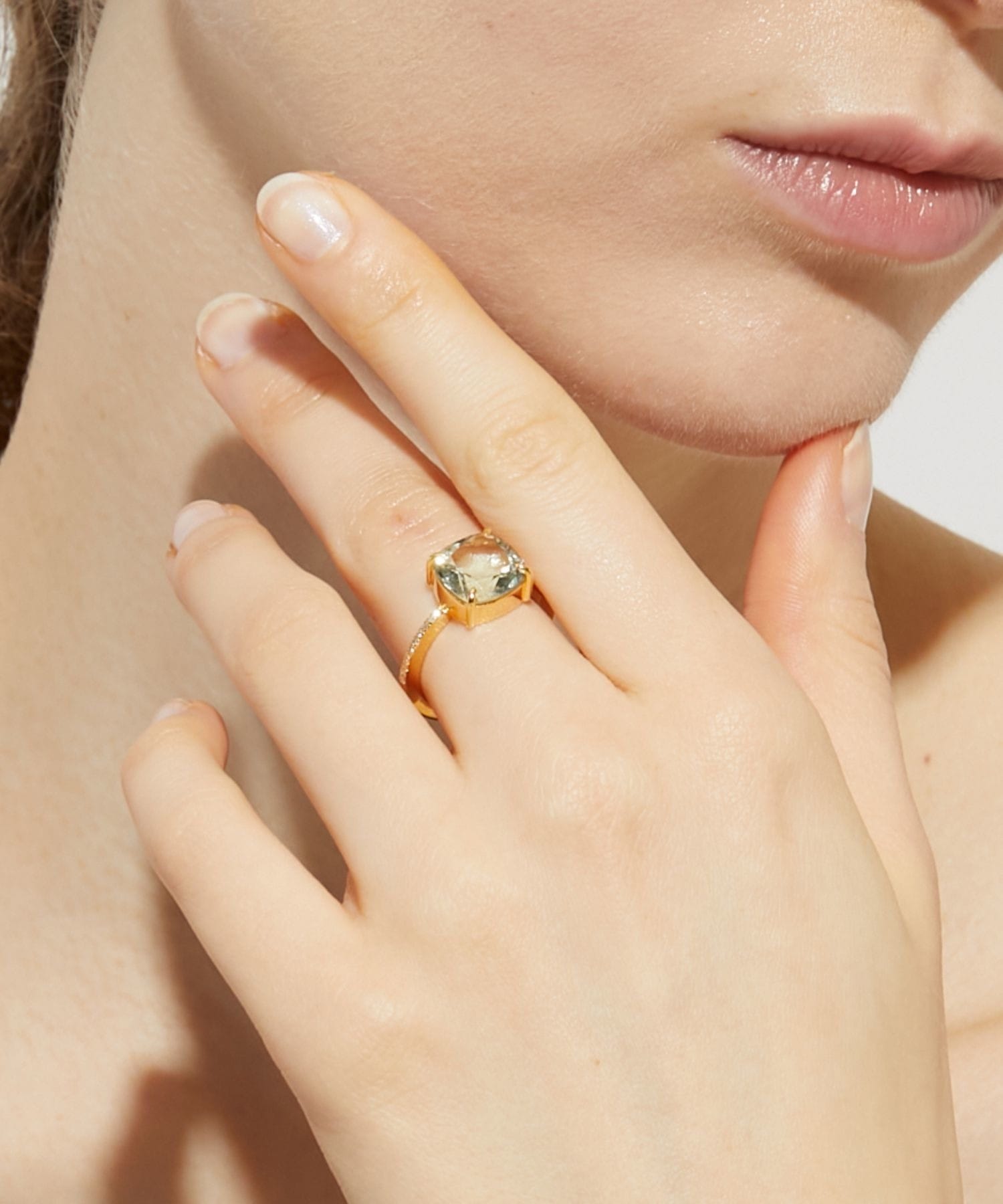 The green amethyst resembles dewdrops dripping from the tip of a leaf. The cushion cut, with its beautiful rounded, soft square shape, is low, making it easy to wear and giving it a modern impression. The half eternity design with a brilliant single-cut diamond is a timeless classic.