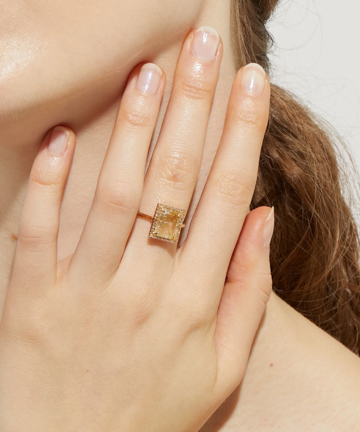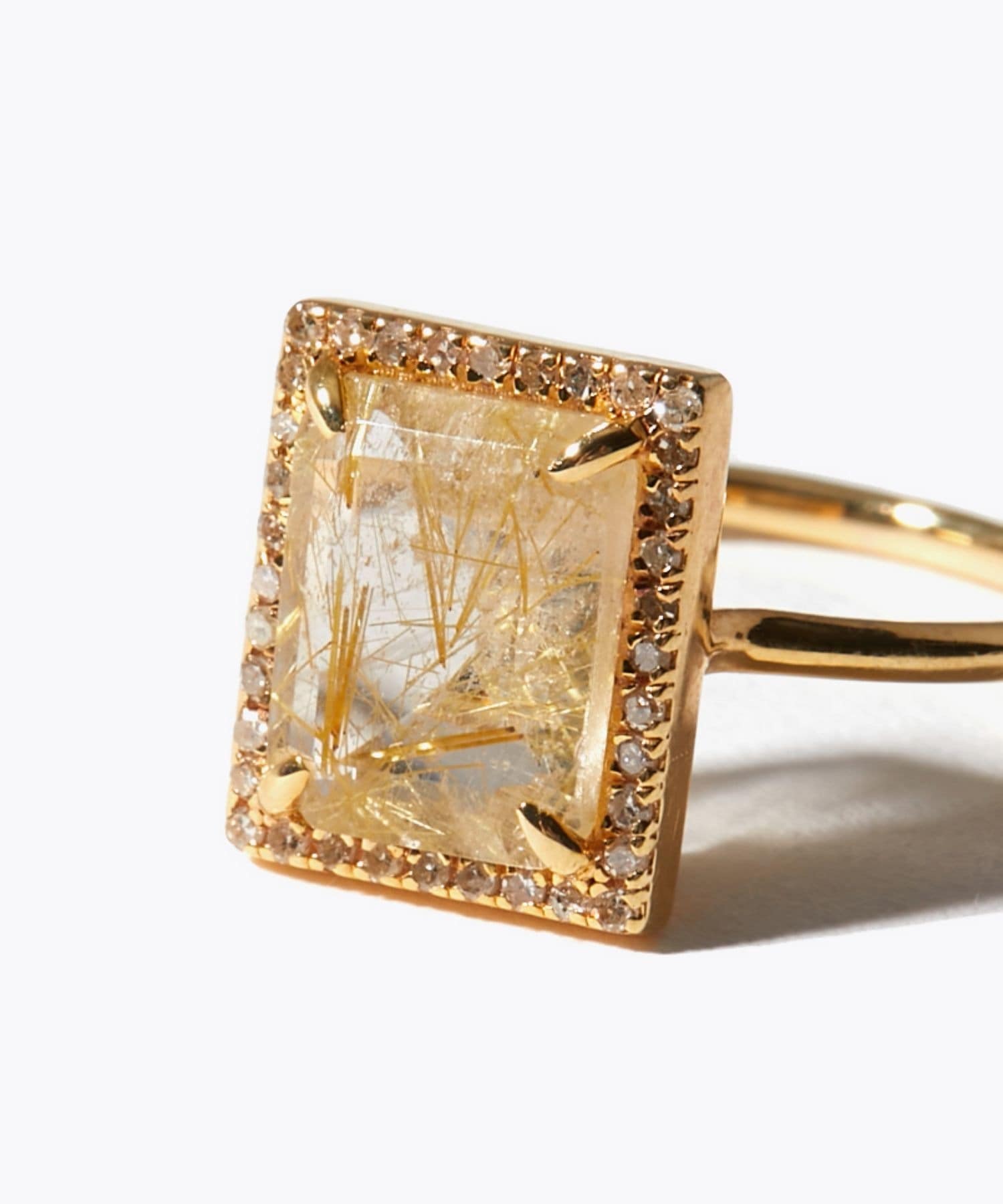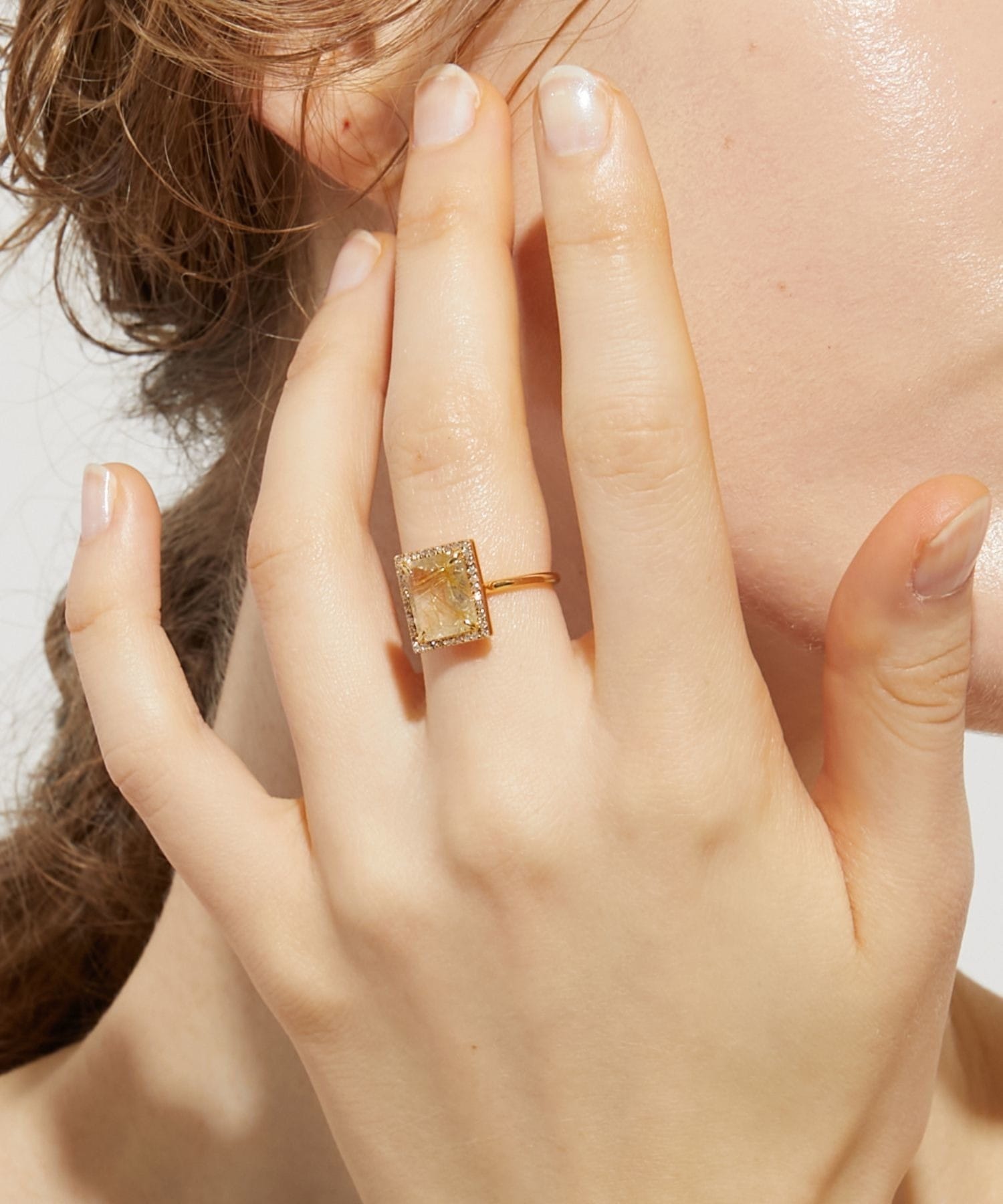 This ring features a large rectangular-cut rutilated quartz stone selected in Jaipur, India, allowing you to fully enjoy the beauty of the golden needles within the stone. The stone is surrounded by a brilliant single-cut diamond. While simple, it has a strong presence and its understated color makes it easy to wear.