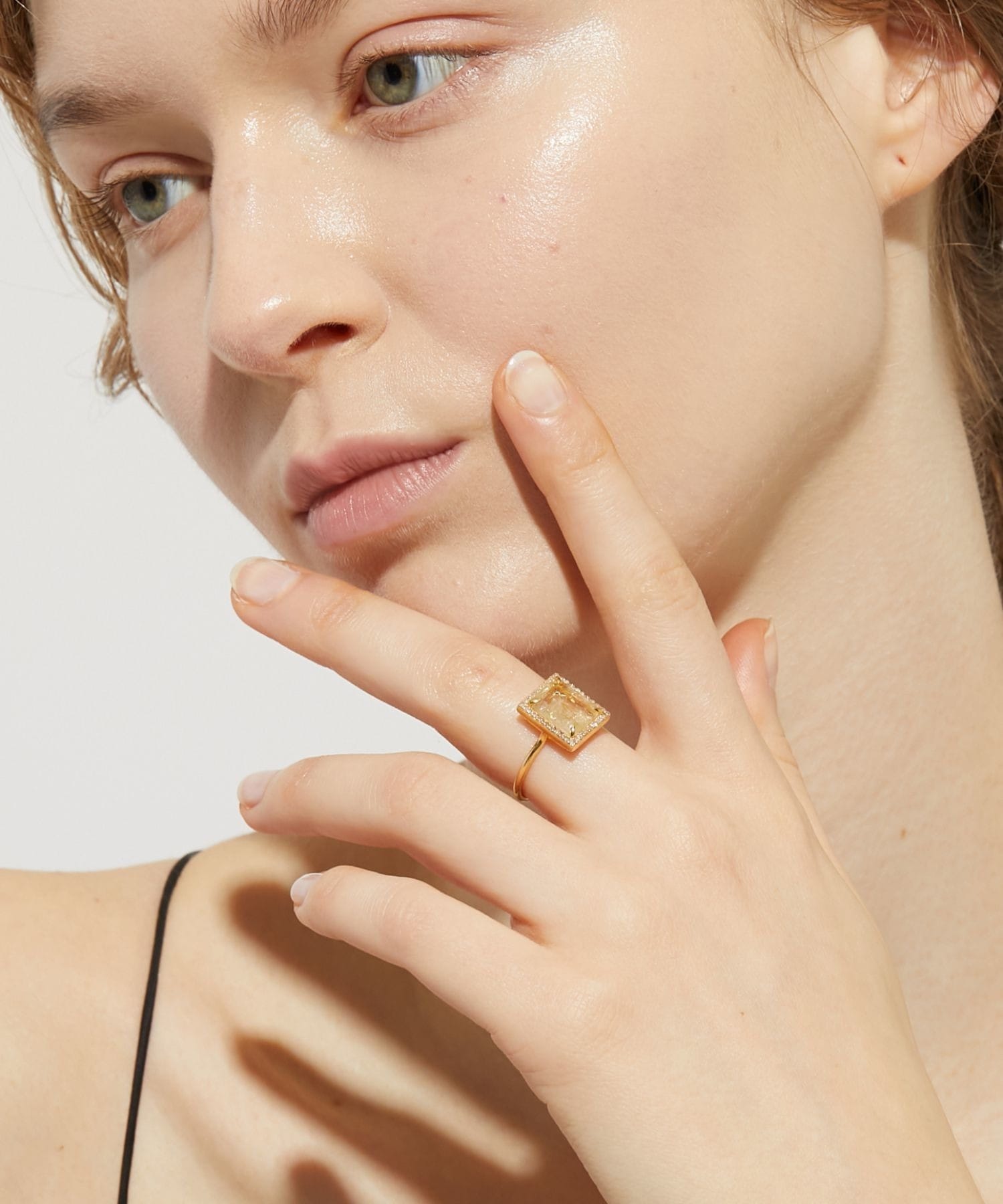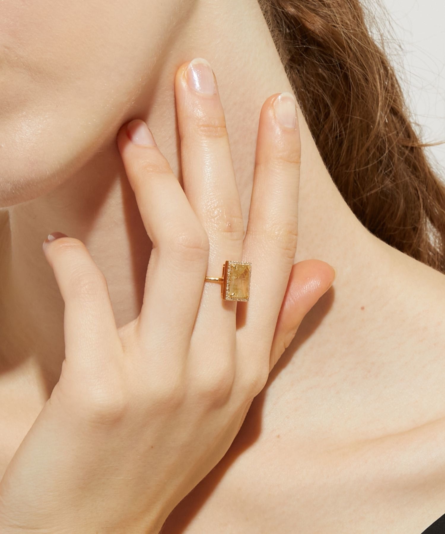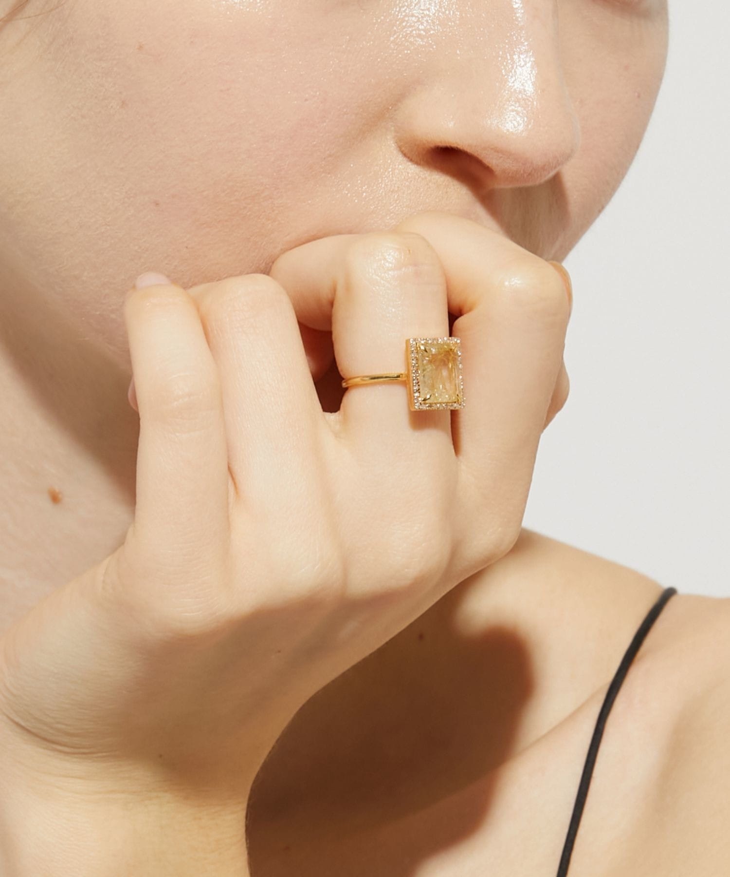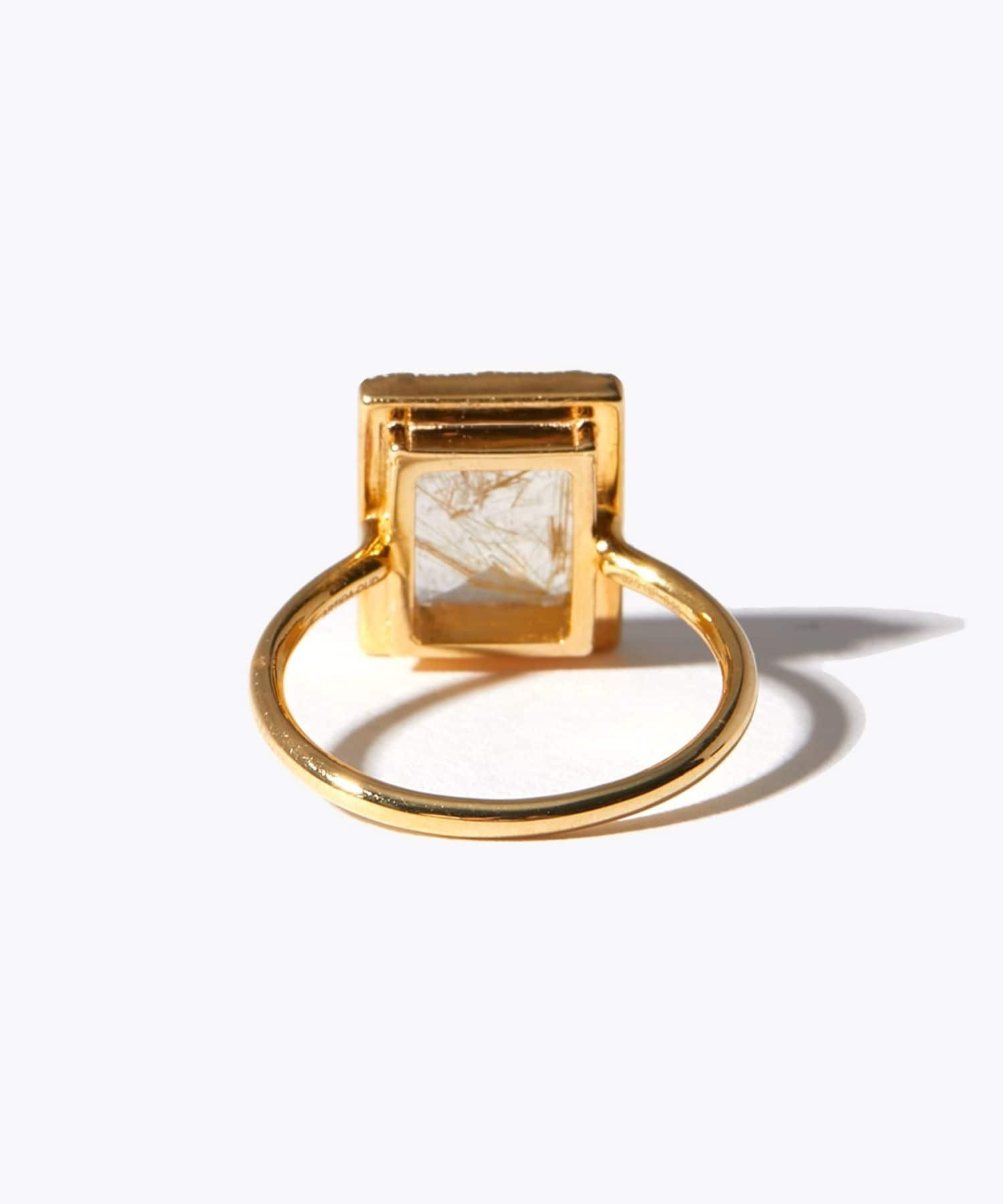 This ring features a large rectangular-cut rutilated quartz stone selected in Jaipur, India, allowing you to fully enjoy the beauty of the golden needles within the stone. The stone is surrounded by a brilliant single-cut diamond. While simple, it has a strong presence and its understated color makes it easy to wear.