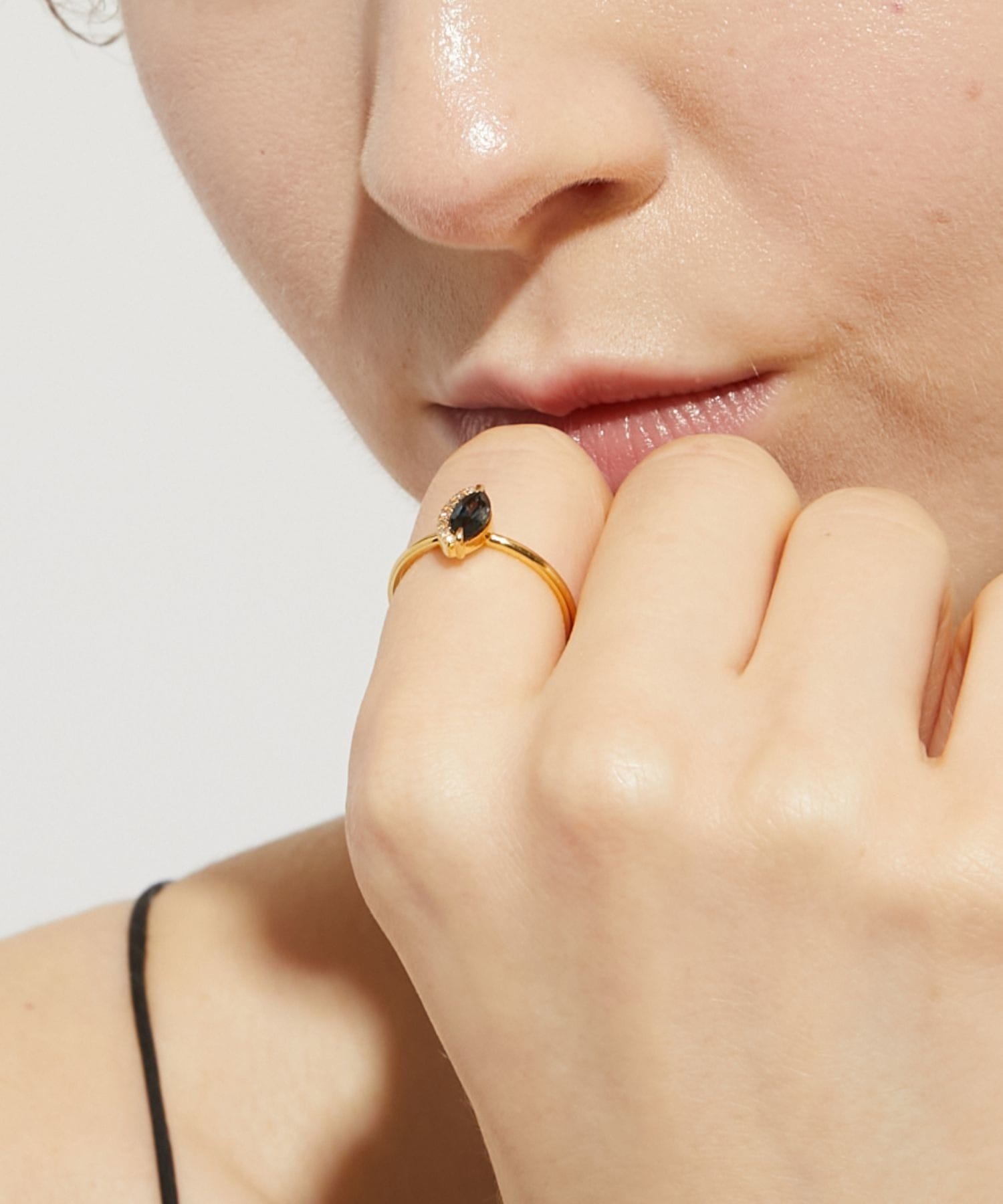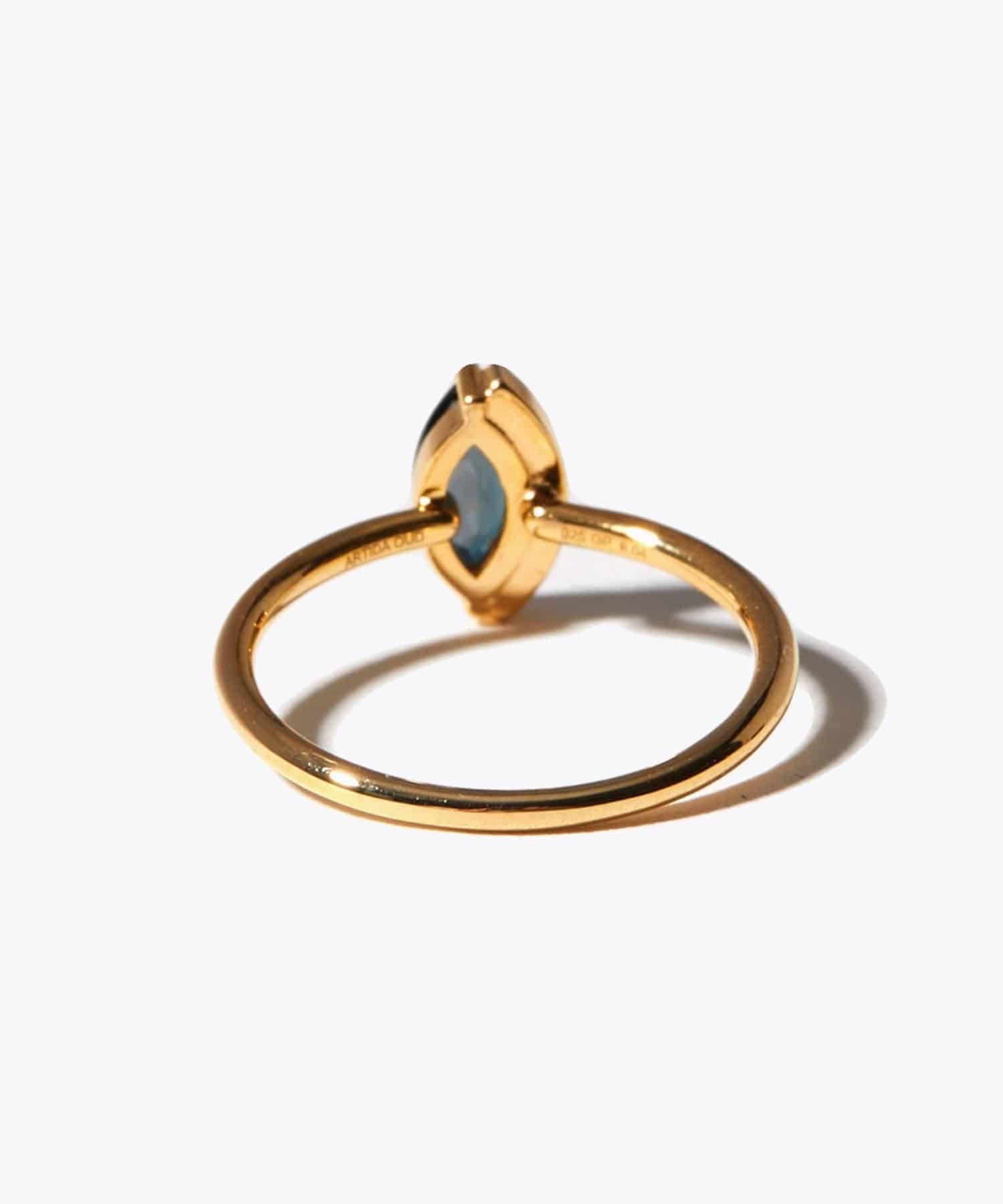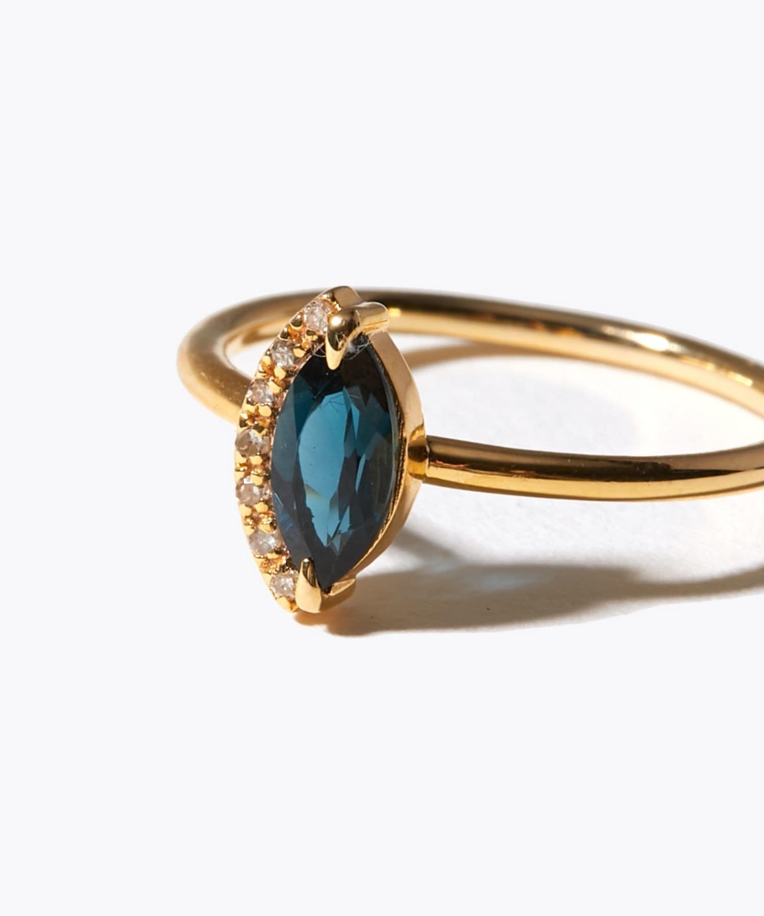 This ring features a marquise-shaped London blue topaz reminiscent of the deep sea and pav? diamonds. The stone's size makes it suitable for everyday wear, yet its deep blue color is striking. We also recommend layering it with other natural stones.