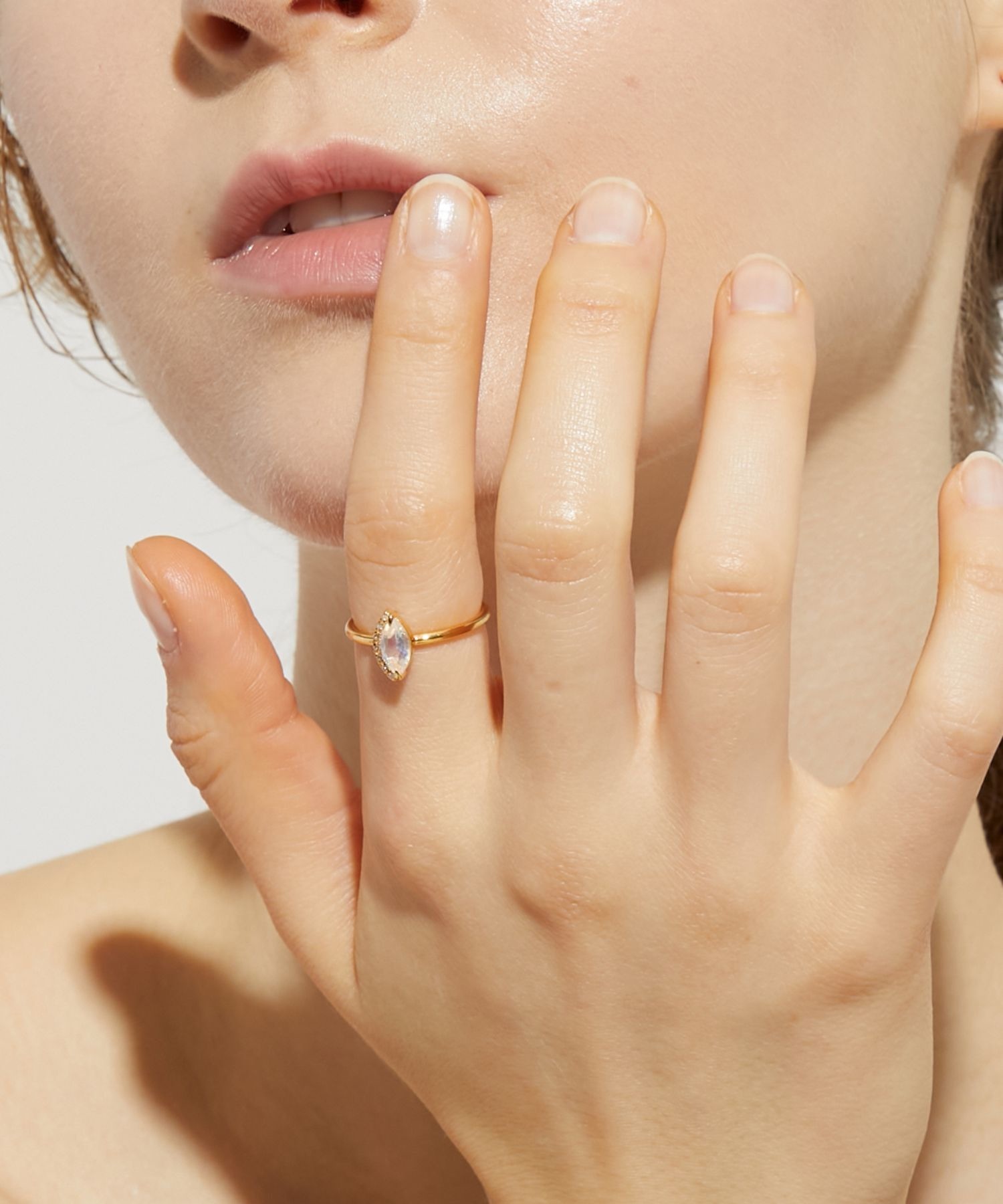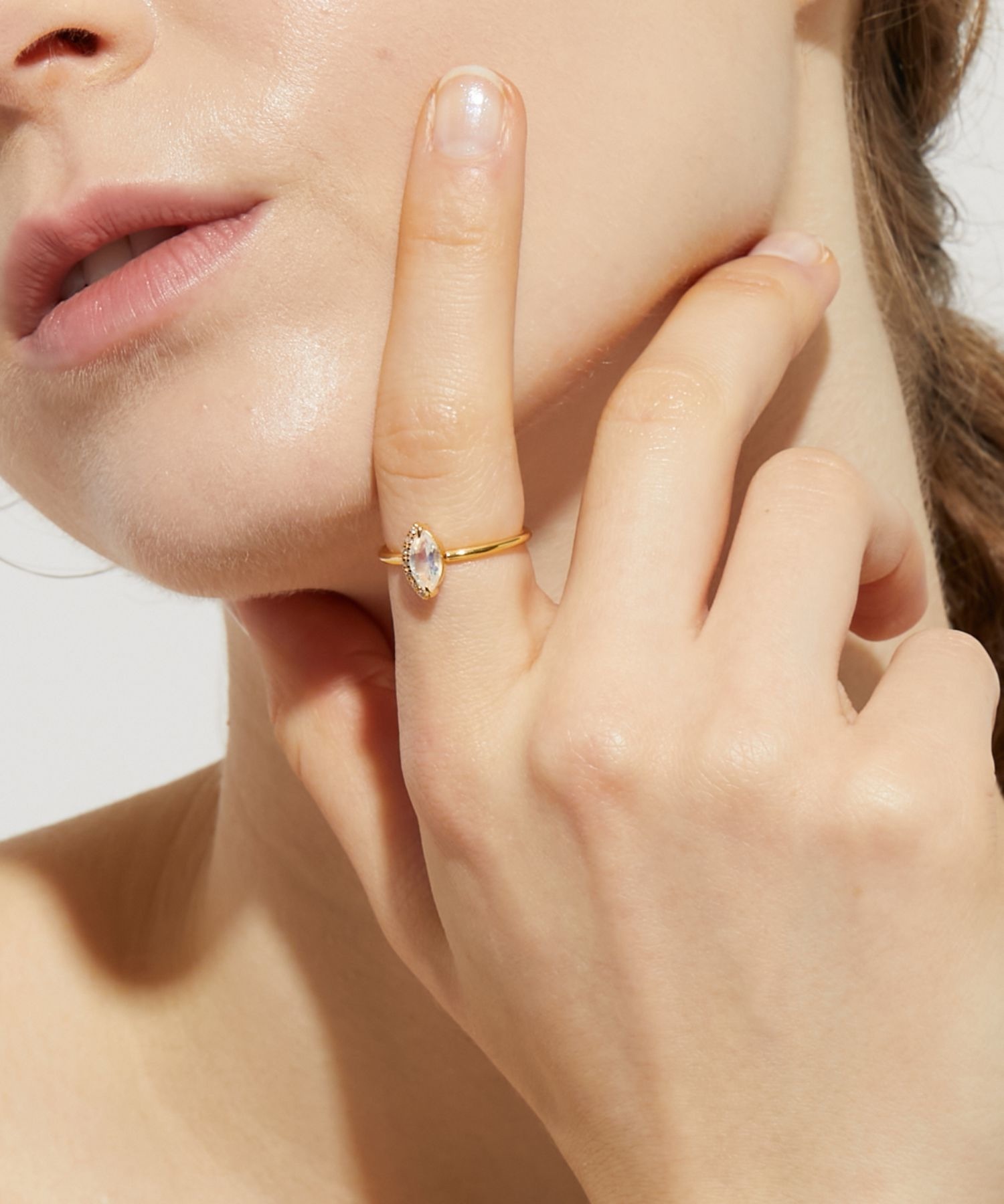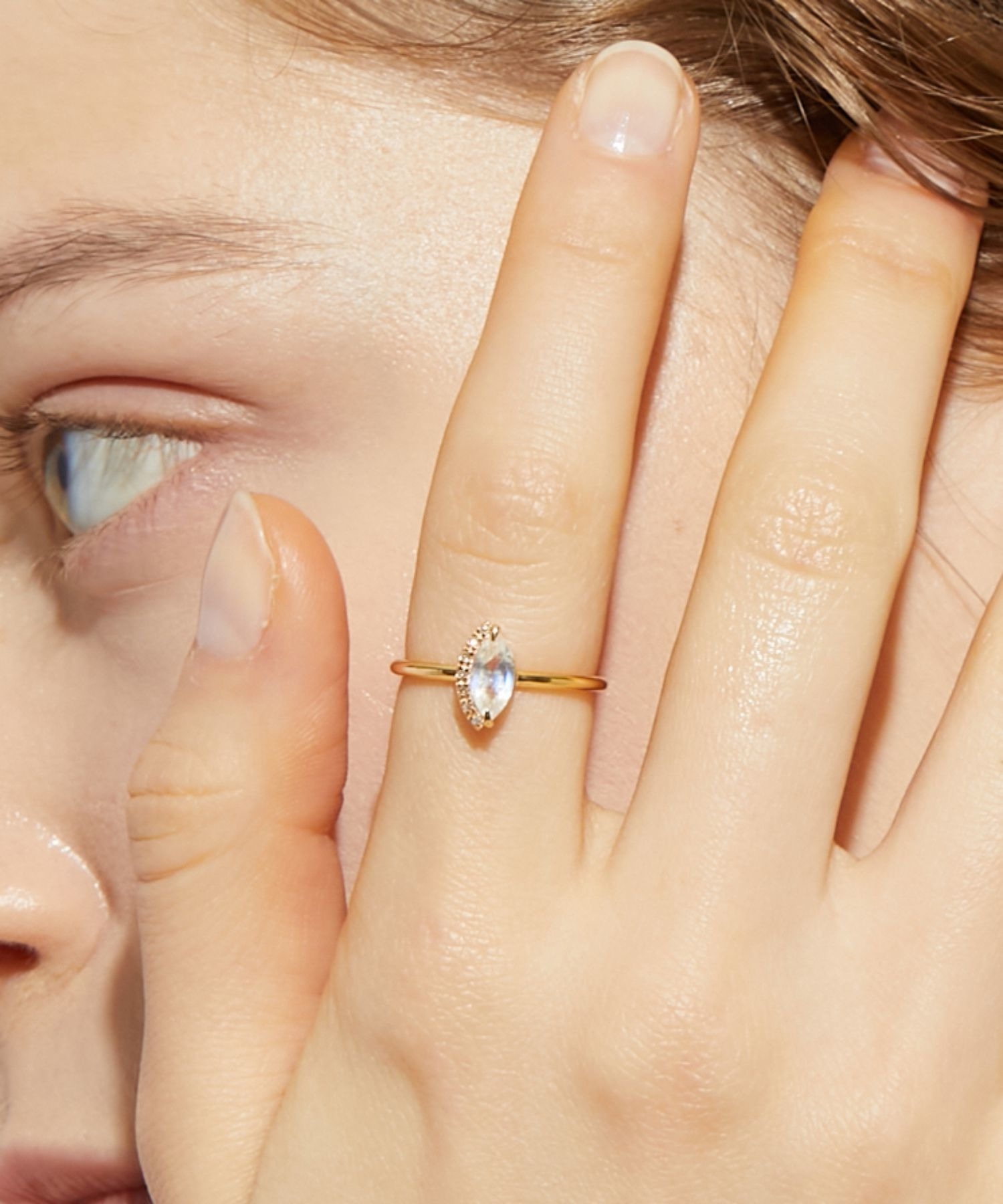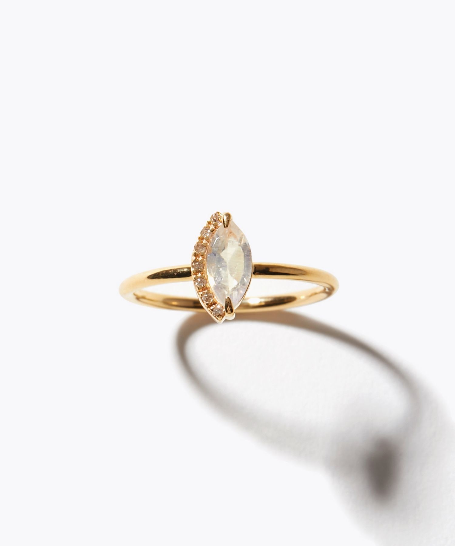 This ring features a marquise-shaped rainbow moonstone that exudes iridescent light and pav? diamonds. The size and color of the stone make it suitable for everyday wear, and it will easily match any outfit. We also recommend layering it with other natural stones.