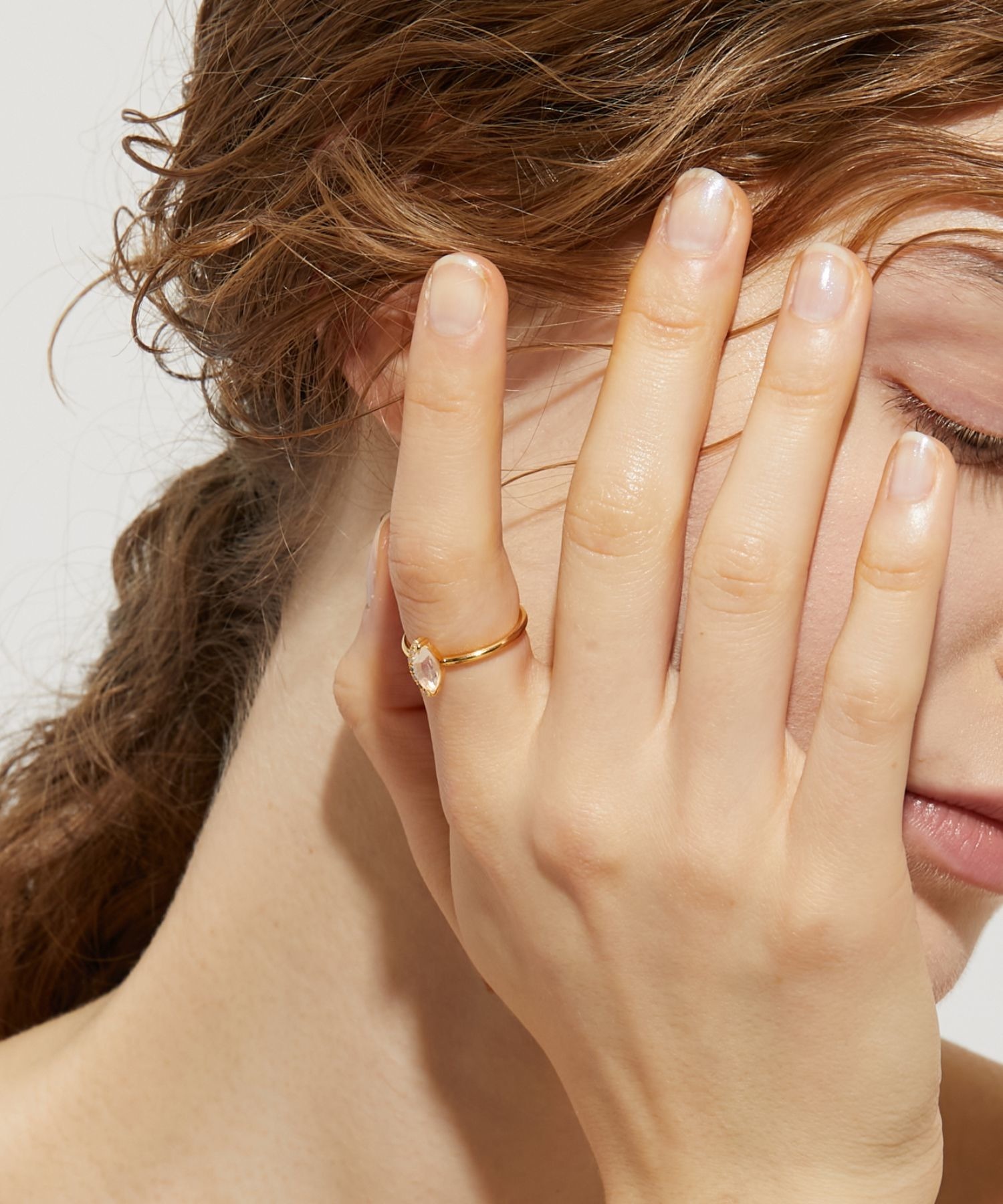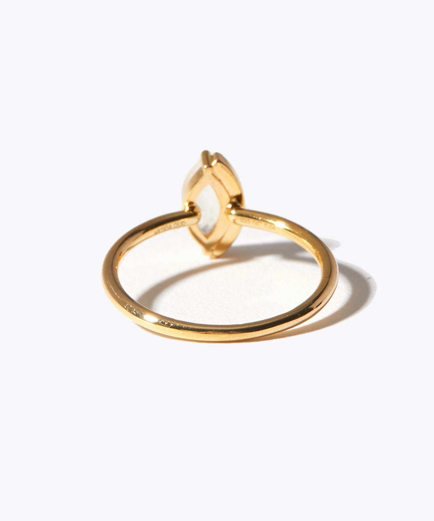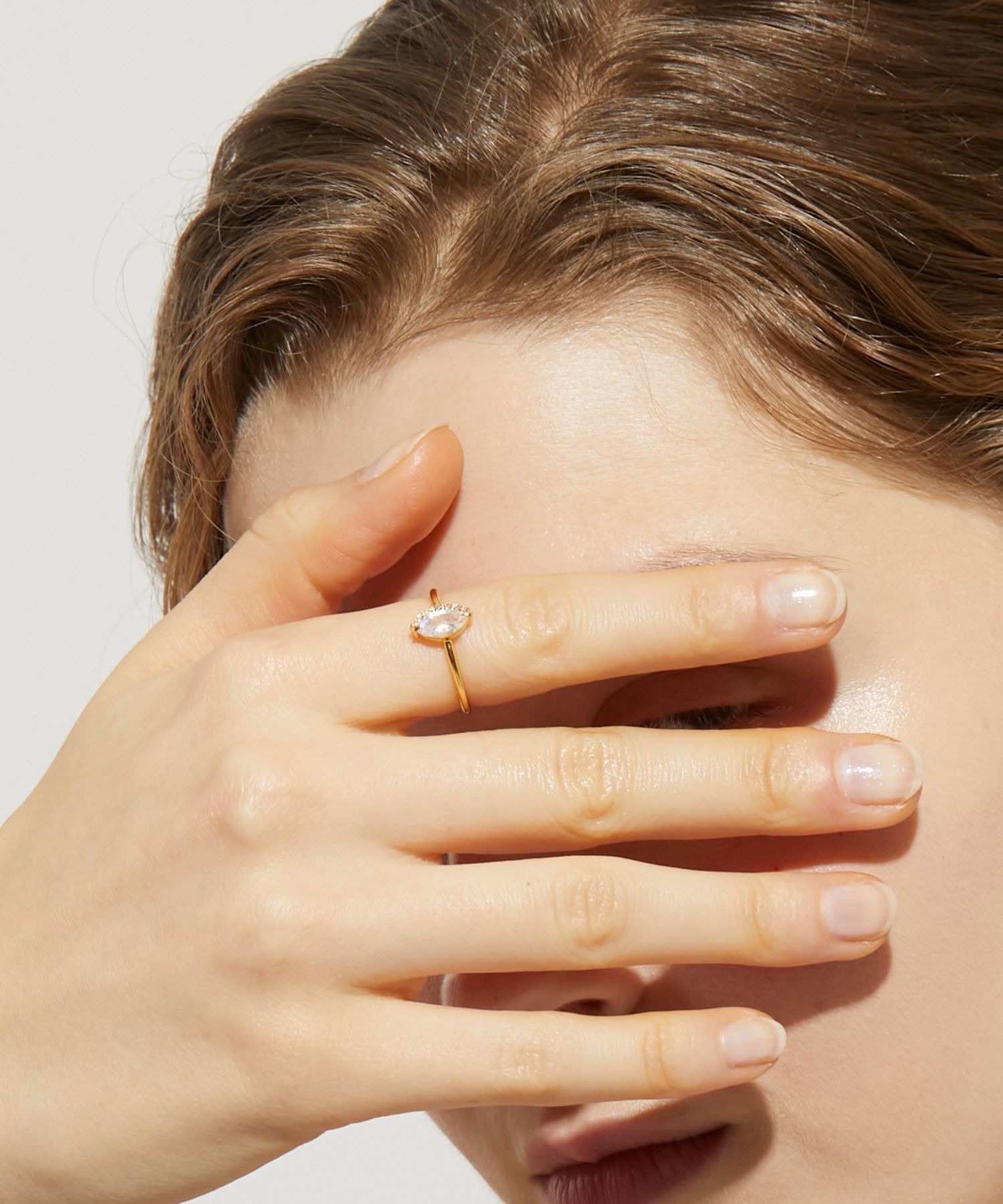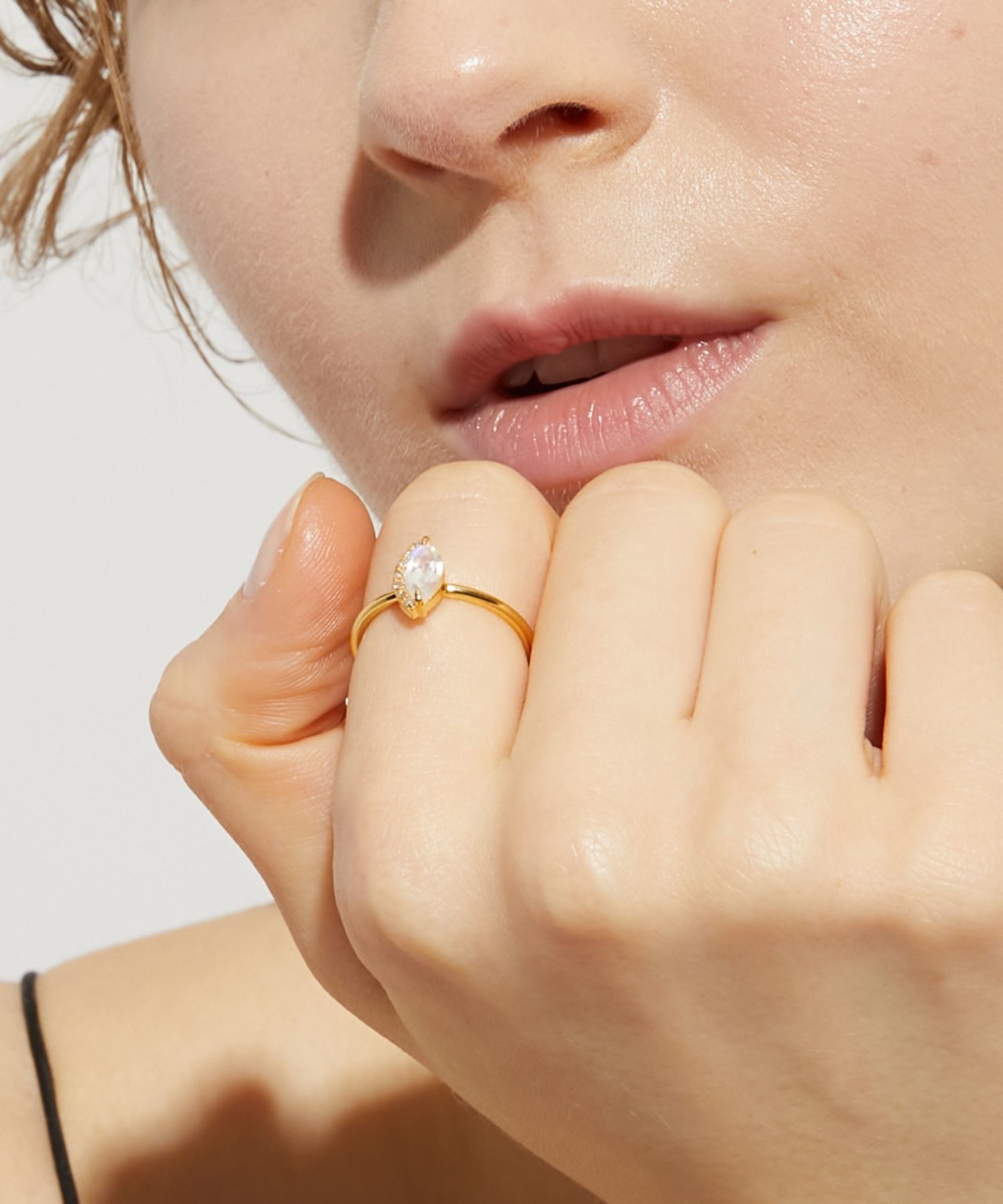 This ring features a marquise-shaped rainbow moonstone that exudes iridescent light and pav? diamonds. The size and color of the stone make it suitable for everyday wear, and it will easily match any outfit. We also recommend layering it with other natural stones.