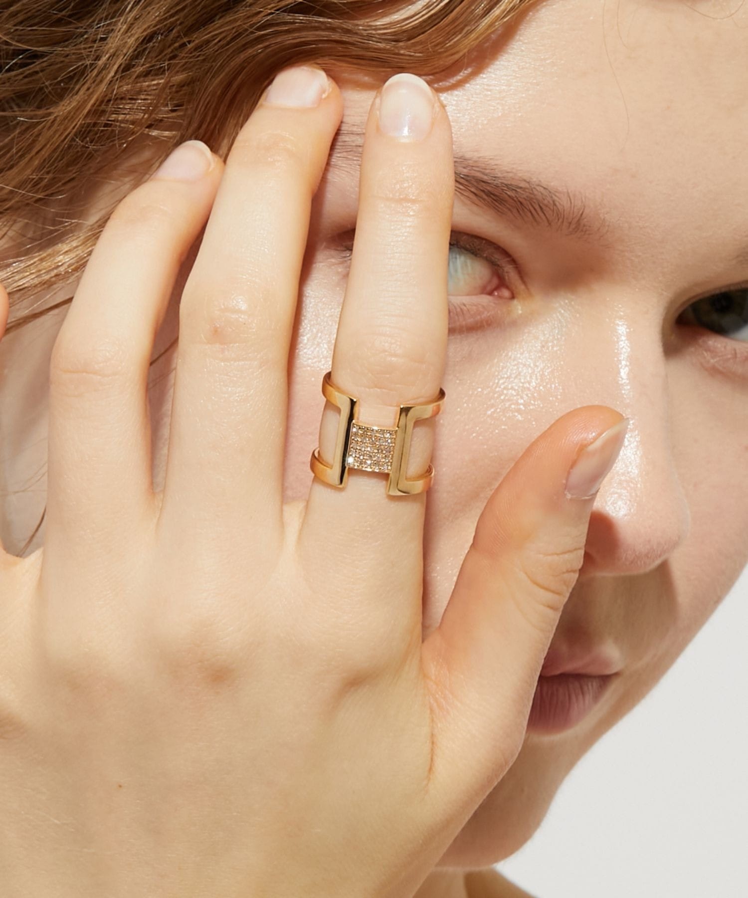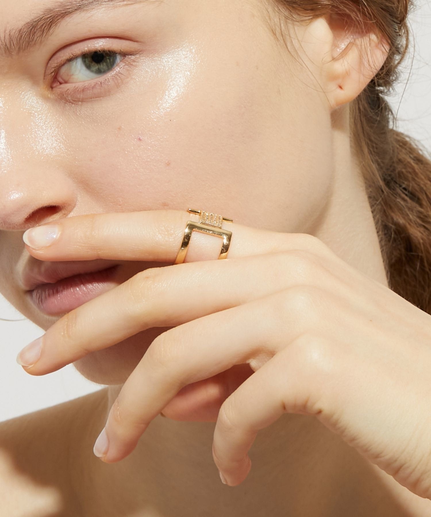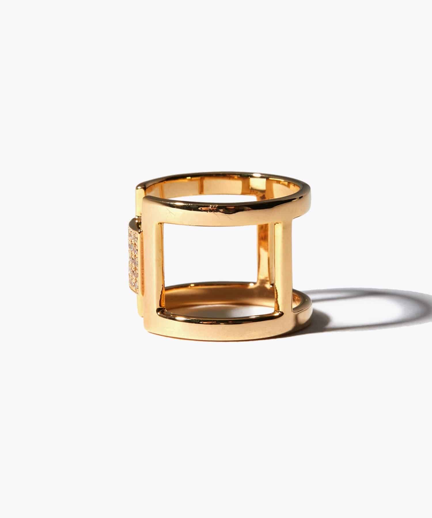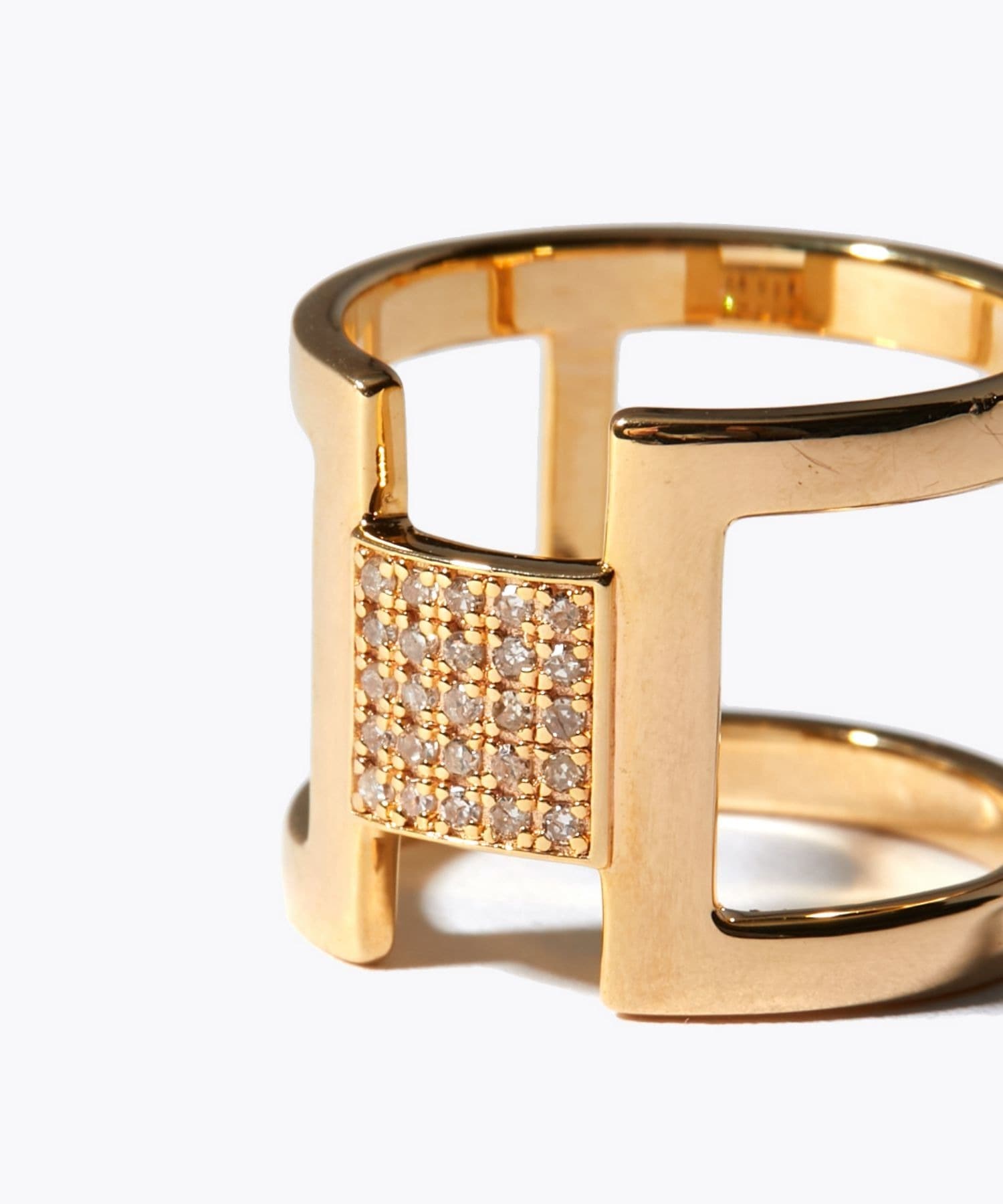 This sophisticated ring has presence and volume, yet fits neatly on the fingertip. The geometric pattern, inspired by the glamorous mood of the 1980s, emits a brilliant light. The sparkle of the delicate melee diamonds is enhanced by layering it with a minimalist ring or chain ring for a more modern look. A timeless design that combines edge and elegance.