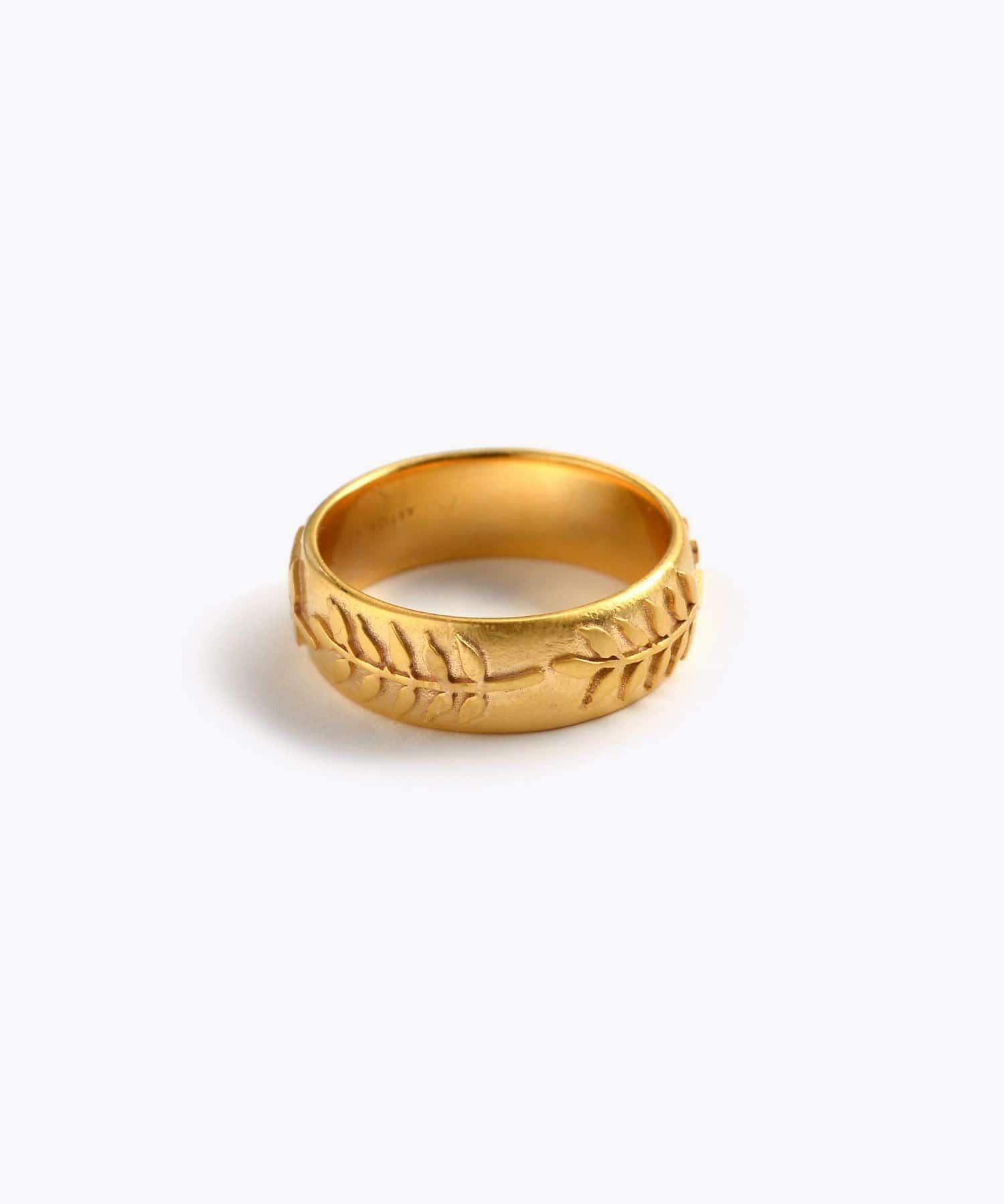 This ring was born from a love for traditional Indian jewelry craftsmanship. The surface of the ring features a curry leaf motif meticulously engraved into its simple form, allowing you to feel its delicate breath on your fingertips. Layer it with other rings from the same ancient series or chain rings to add a subtle depth and rhythm to your fingertips.