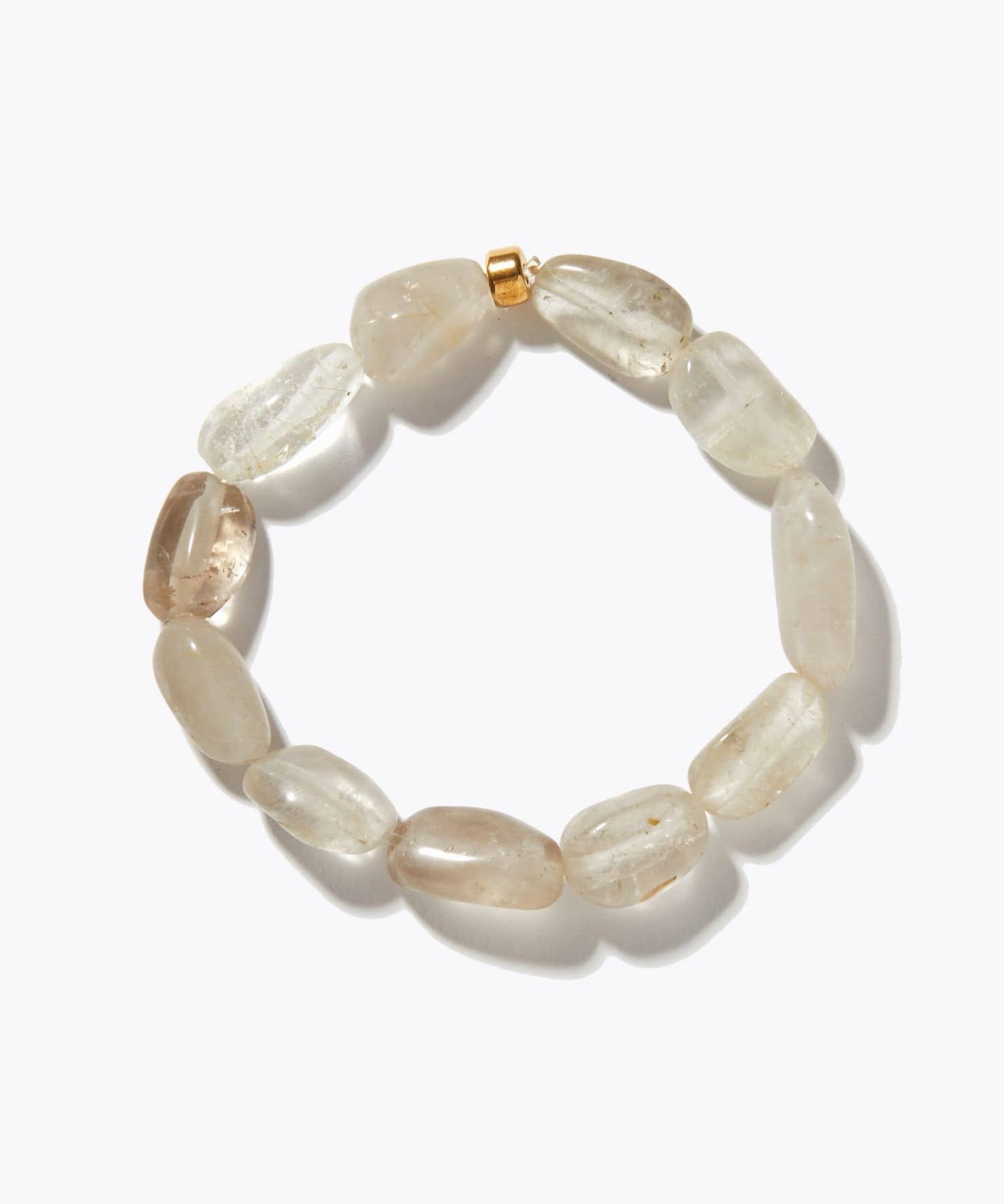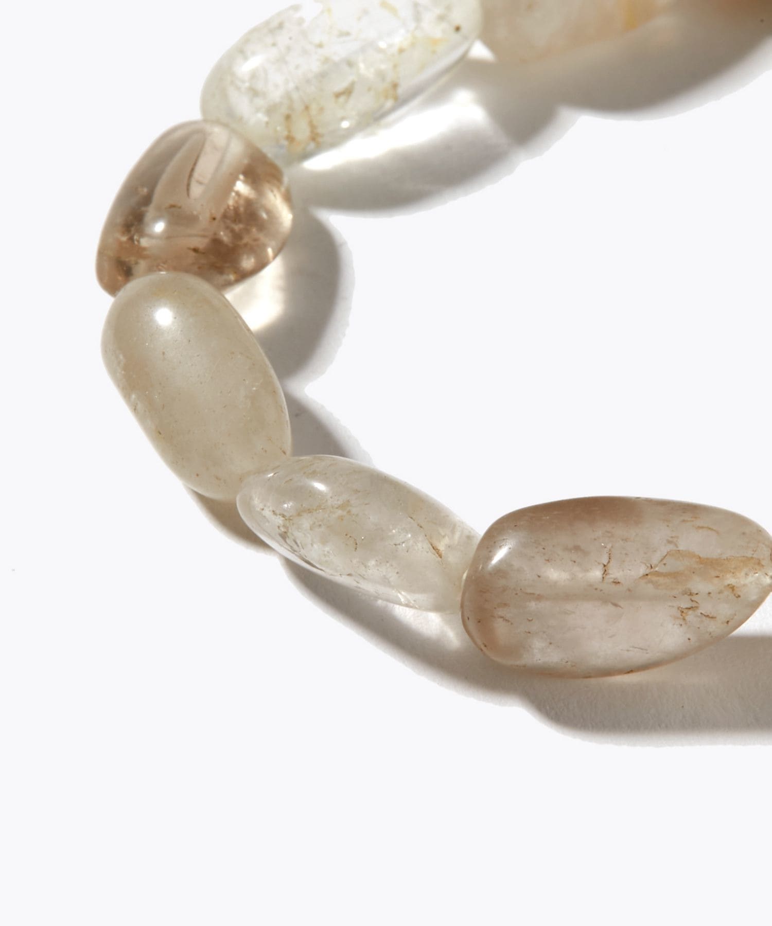 We discovered deadstock natural gemstones in Jaipur, India. Each unique stone, in its own unique color and shape, has been strung together to create this bracelet. The soft gold rutilated quartz, reminiscent of a sunlit spot, is easy to wear and we recommend layering it with other gemstones from the same series. These natural stones, which contain infinite energy, act as a charm to grant your wishes and subtly enhance your everyday look.