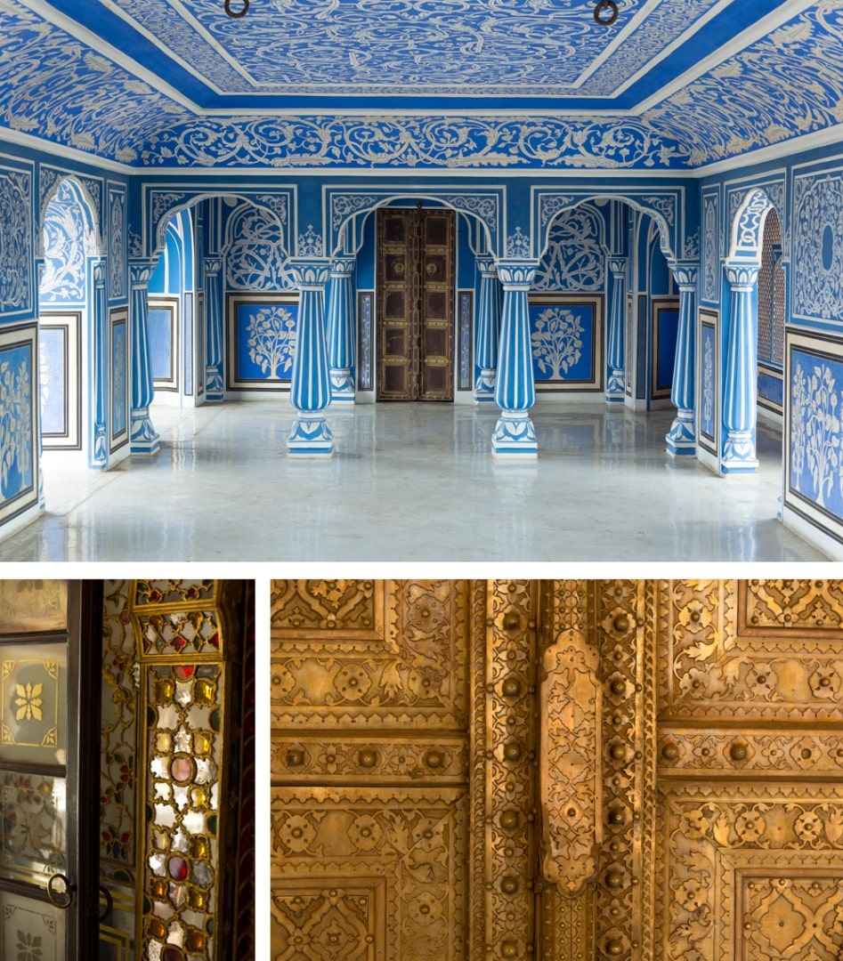 シティ・パレスの敷地の一部は博物館として一般公開されており、エリアによって異なる装飾や建築様式を見ることができます。デザインのヒントを与えてくれる、インドの職人の素晴らしい技術が詰まった場所。上:とりわけ気に入っているのは、美しいロイヤルブルーに真っ白なペイントを施した「青の部屋」。下左:モザイクのようにカラフルに宝石を散りばめた壁面のミラー。下右:扉に彫られたゴールドカラーの美しい文様。