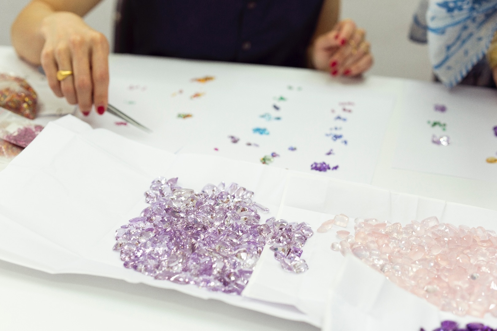 種類別にわけられた石をピンセットで選び、その場で買い付けします。個性ある煌めきを逃さぬよう集中力を高めます。
