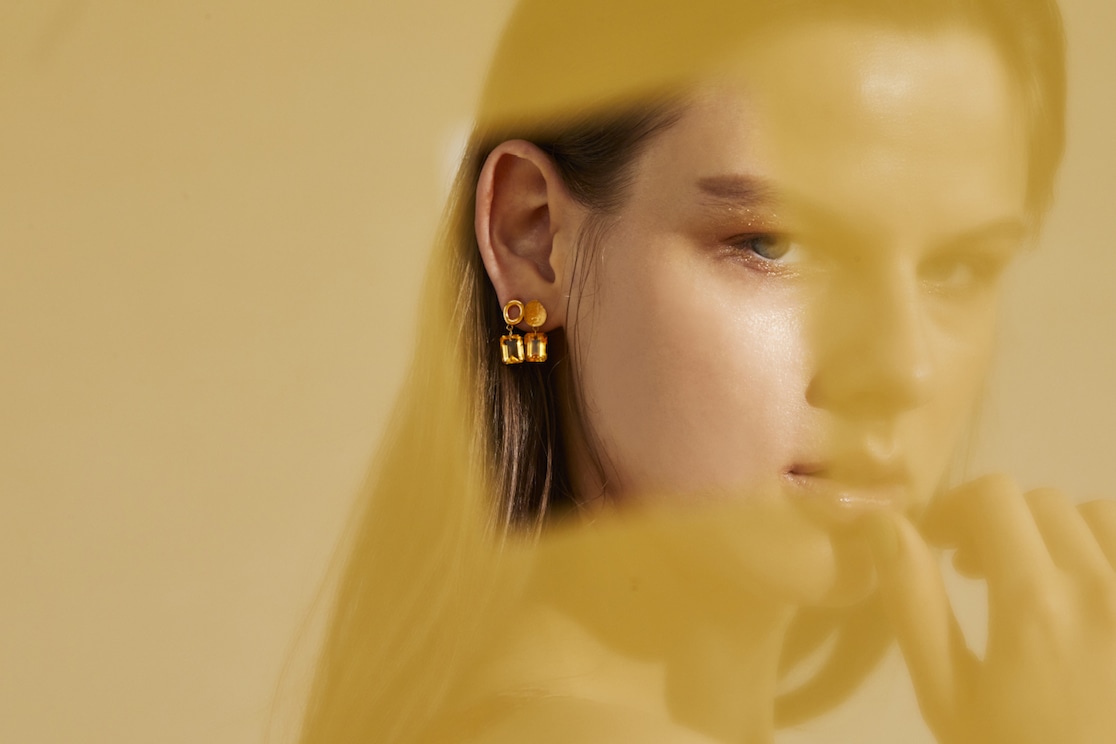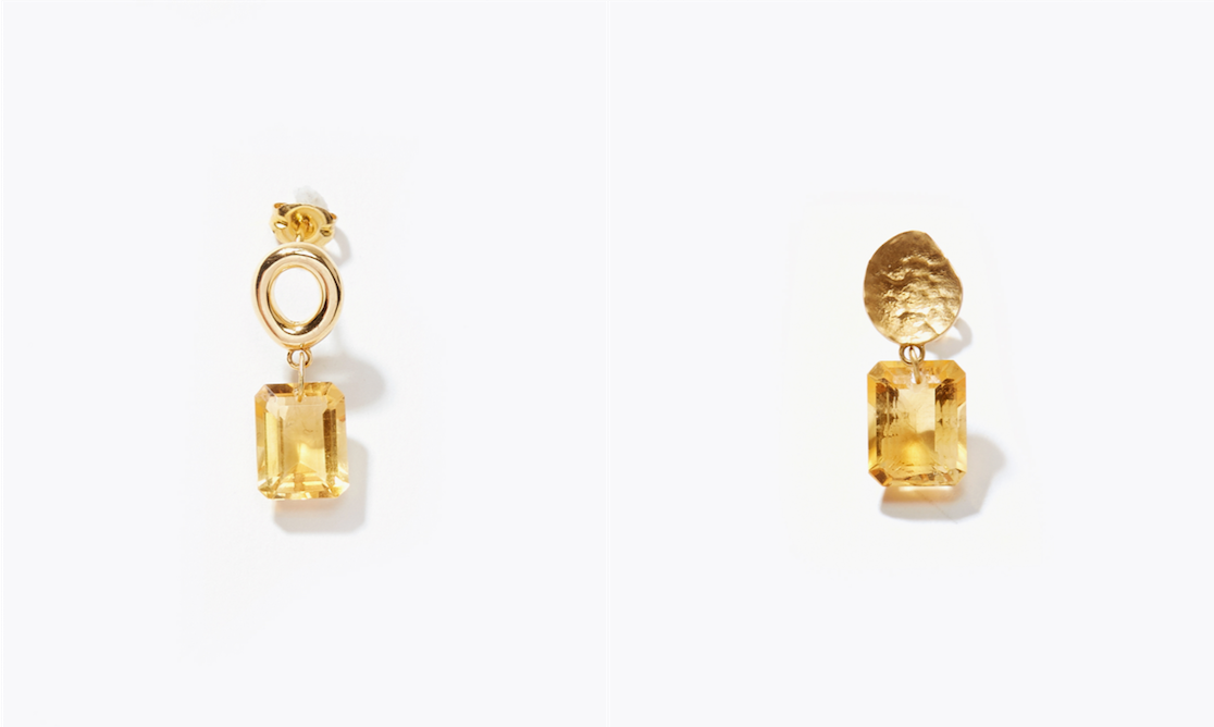 有機的で古代的な風合いのゴールドのモチーフの下に、レクタングルカットのシトリンを垂らしたピアス。それぞれシングル販売なので、左右違うデザインをペアとして着けるのもおすすめです。
