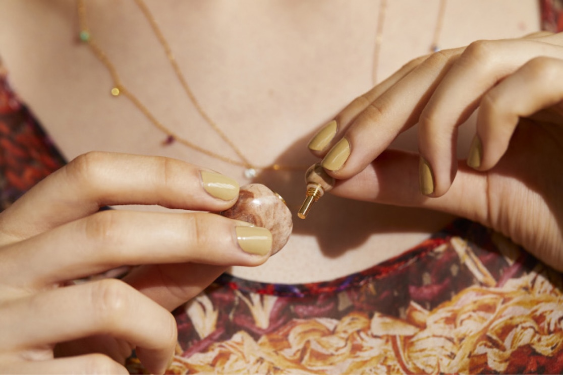 幻想的な“eutopia”からの新作は、天然石を香水ボトルのシェイプに削り出したチャームです。キャップがネジ式になっているので、香水を少し垂らしてお使いいただくことができます。