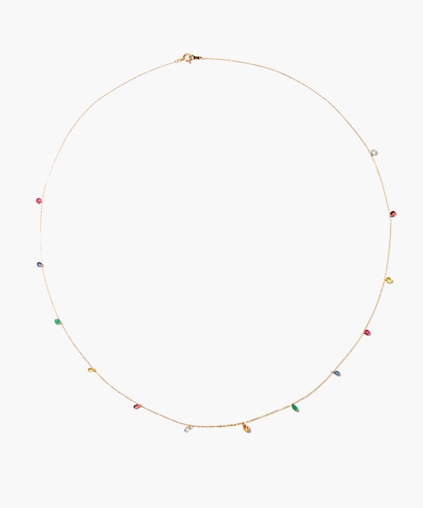 7種のマルチストーンをルースのまま垂らした、全長60cmのロングネックレス。ブルートパーズ、ピンクトルマリン、イエローサファイア、ルビー、ブルーサファイア、グリーンガーネット、オレンジサファイアを使用した、まさに虹色のジュエリーです。