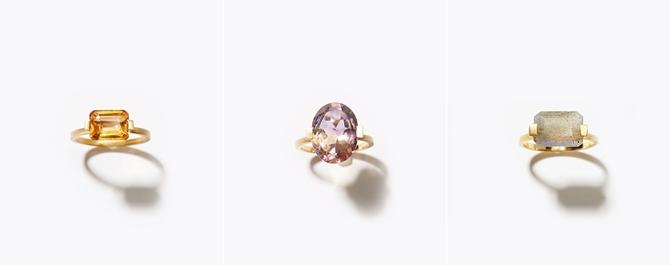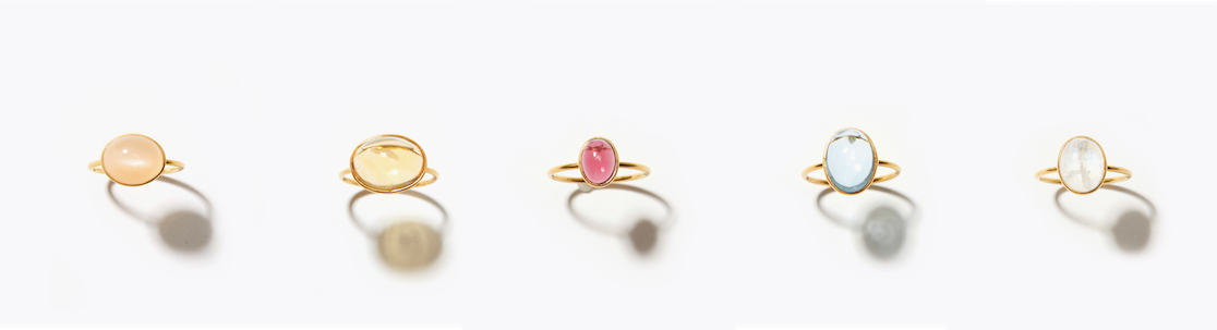 飴玉のようなカボションカットのカラーストーンを、シンプルにK10YGの地金で取り巻いたリングたち。左から、珍しいオレンジムーンストーン、蜂蜜のようなシトリン、赤紫のロードライトガーネット、涼やかなブルートパーズ、神秘的なレインボームーンストーン。