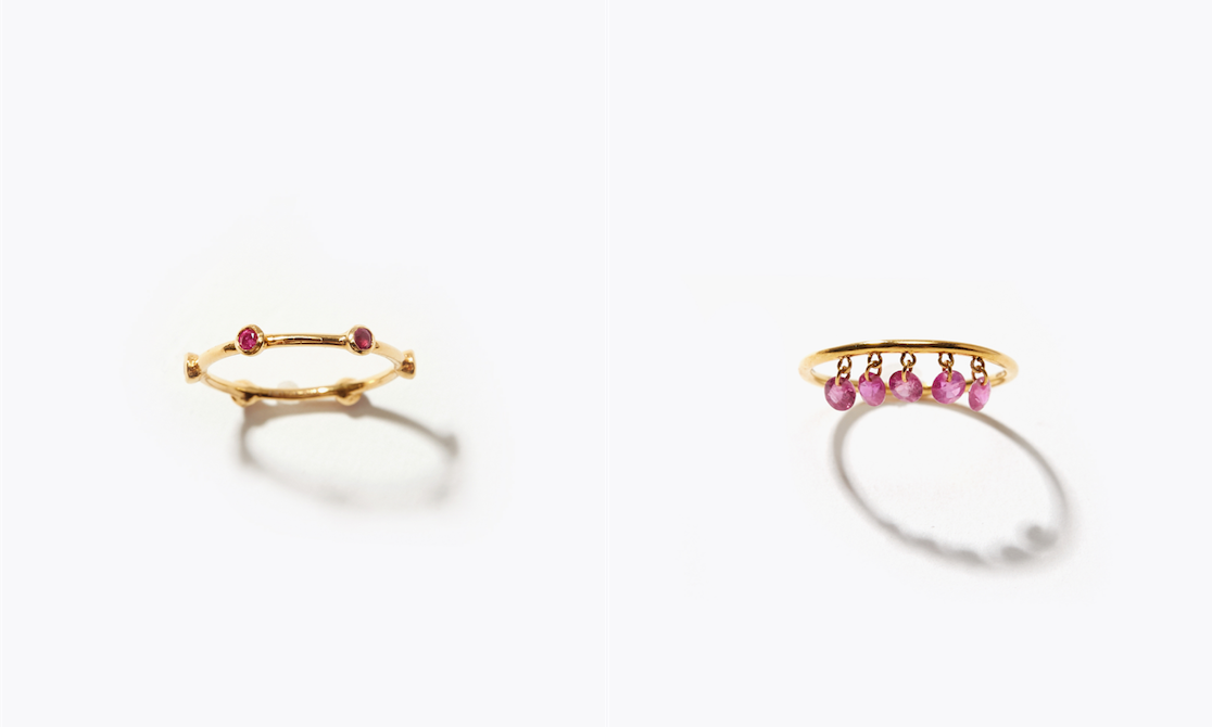 透明感と発色が美しい鮮烈なピンク色のルビー。K10YGをベースに、ラウンドカットを覆輪留めにして6粒配した華奢なリングと、ラウンドストーンをフリンジ状に5粒垂らしたリング。2本を重ね付けすると、軽やかなアラビアンルックを楽しめます。