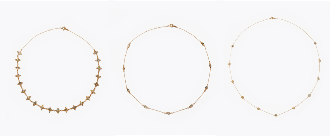 オパールと、手の込んだ金粒細工のモチーフを配した豪華な2種のチョーカー。そして段をつけたサークルで覆輪留めにしたモチーフを、ステーション状に配したロングネックレス。