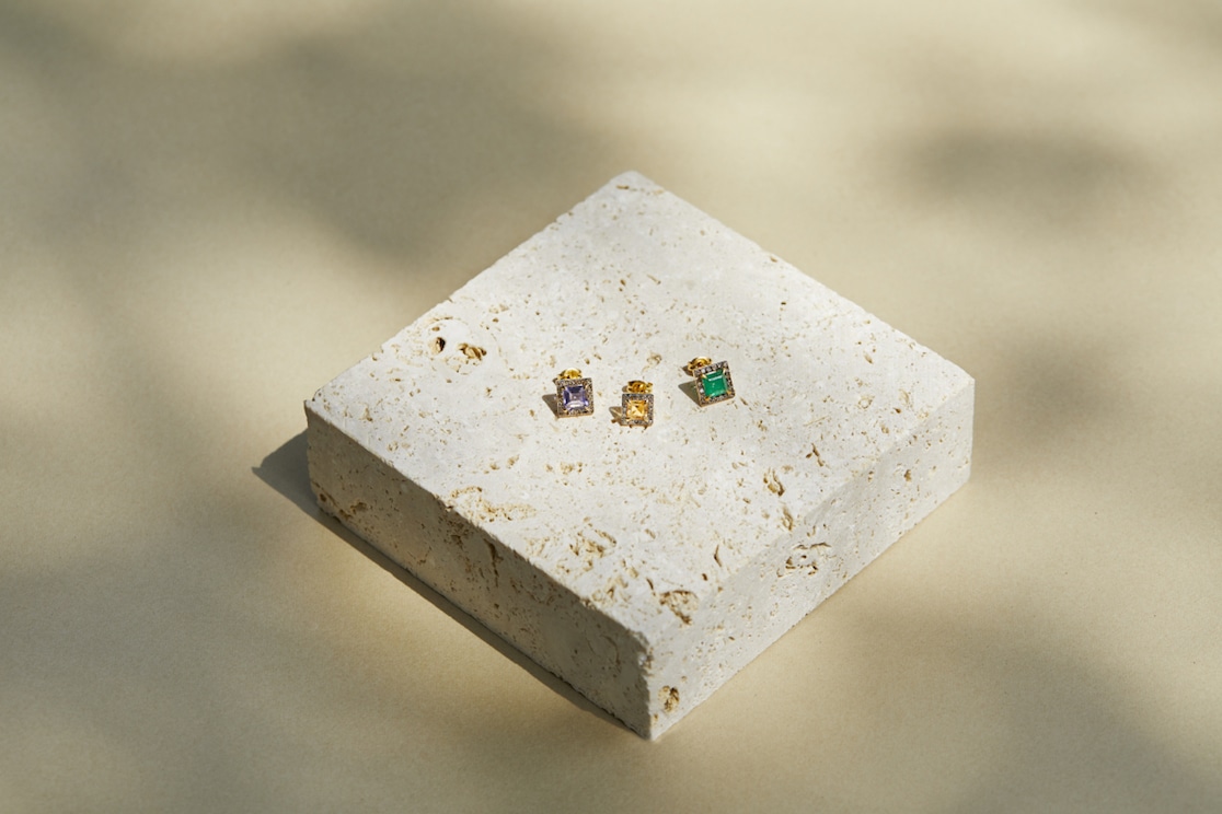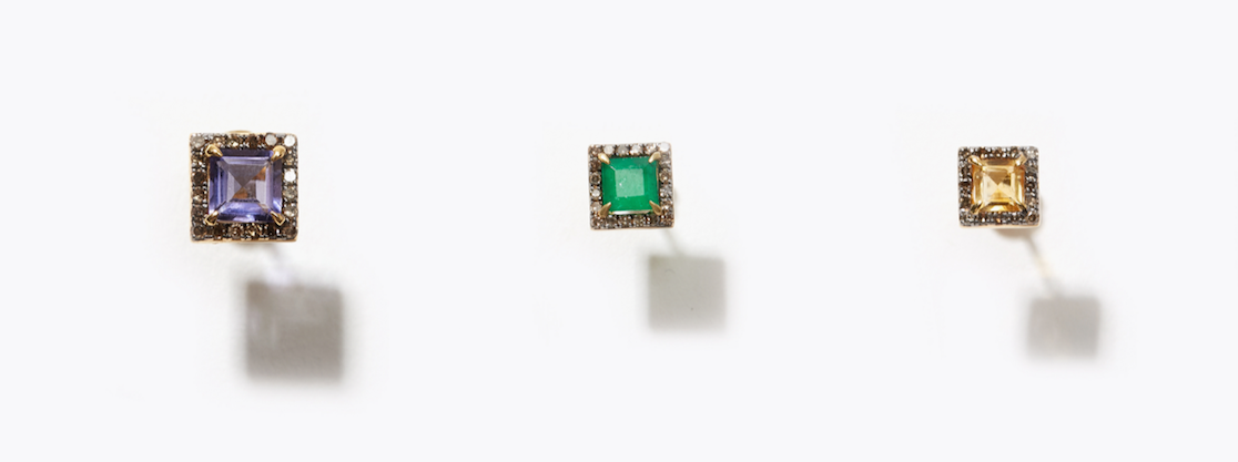 [elafonisi] square iolite pave diamond stud pierced earring 15,400yen (with tax) / [elafonisi] square emerald pave diamond stud pierced earring 17,600yen (with tax) / [elafonisi] square citrine pave diamond stud pierced earring 15,400yen (with tax)