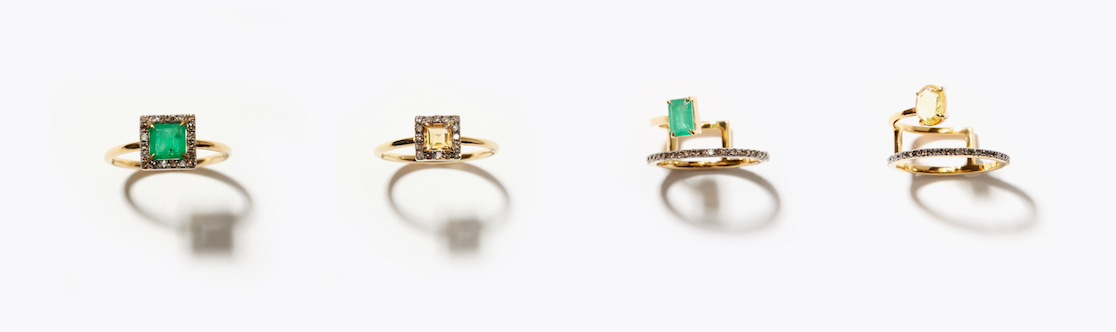 [elafonisi] square emerald pave diamond ring 26,400yen (with tax) / [elafonisi] square citrine pave diamond ring 25,300yen (with tax) / [elafonisi] rectangle emerald pave diamond double open ring 39,600yen (with tax) / [elafonisi] oval citrine pave diamond double open ring 37,400yen (with tax)