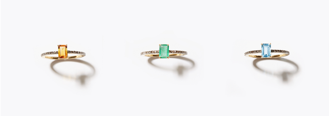 こちらはレクタングルカットのシトリン、エメラルド、ブルートパーズ。それぞれパヴェダイヤモンドのフルエタニティリングに、4本の爪でシンプルに留めました。
