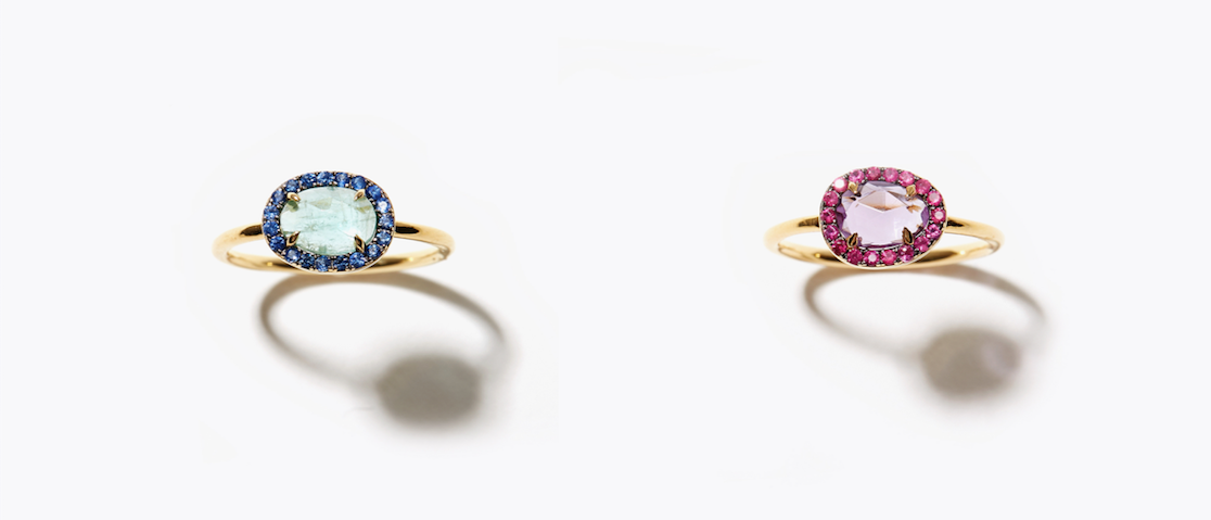 エメラルドのまわりをブルーサファイアのパヴェで取り巻いたリングと、アメジストのまわりをルビーのパヴェで取り巻いたリング。