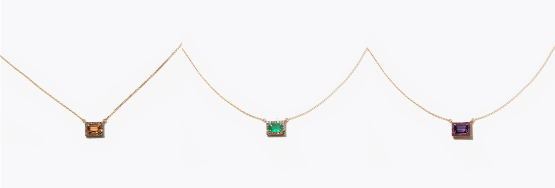 [elafonisi] rectangle citrine pave diamond necklace 40,700yen (with tax) / [elafonisi] rectangle emerald pave diamond necklace 44,000yen (with tax) / [elafonisi] rectangle amethyst pave ruby necklace 40,700yen (with tax)