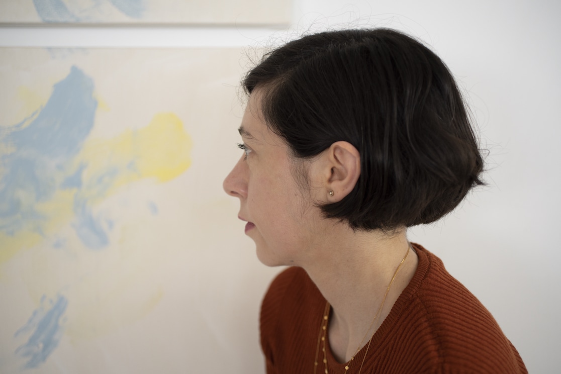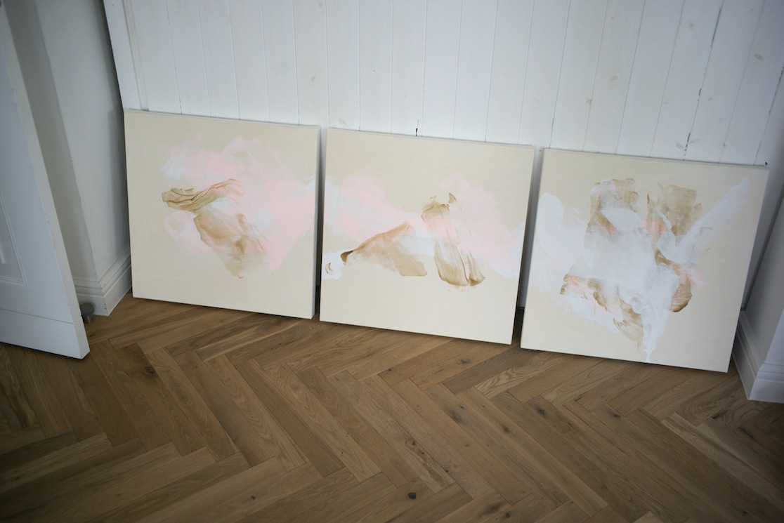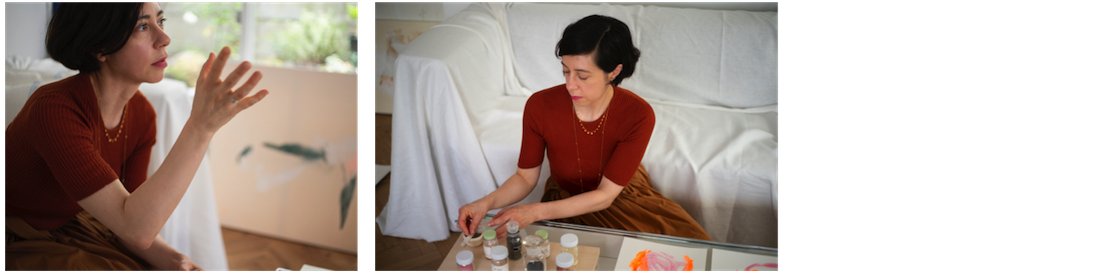 絵とインスタレーションが主です。絵を描くときは、手に顔料をつけて描くことが多いですね。石や貝など自然由来のものを使って、手や腕、肘まで絵の具をつて描きます。もともとダンスが好きだったこともありますし、自分の体の息遣いなどを伝えたいんだと思います。
