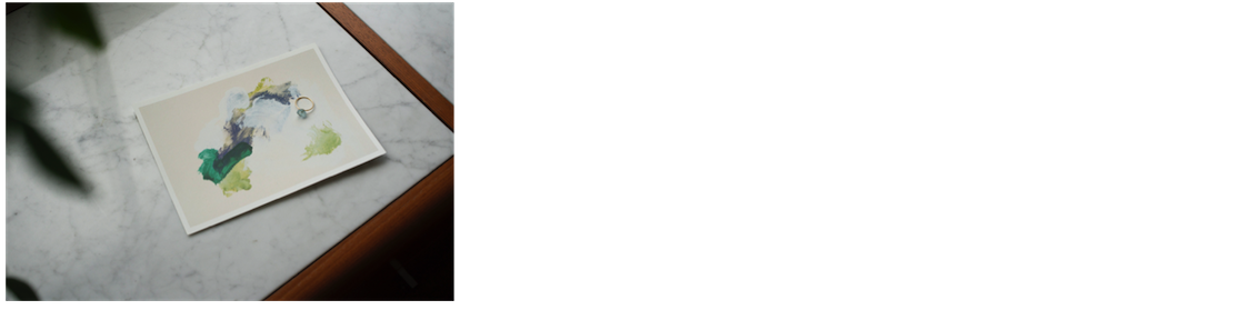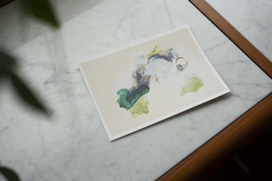 はい、そう考えると、私の作品もARTIDA OUDのテーマ“raw beauty=ありのままの美しさ”と同じです。宝石も、そのままの石が好き。自然のままは、面白いし美しいと思います。私は、自分の作品には、移り変わっていってほしいんです。抹茶を使った絵の線は、最初は緑色だったんですが、自然なものだから時間が経つと茶色になる。そういう変化を楽しみたいです。この青いリングは、石の感じが素敵ですね。