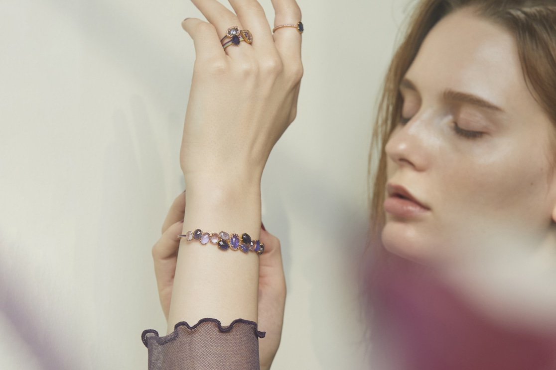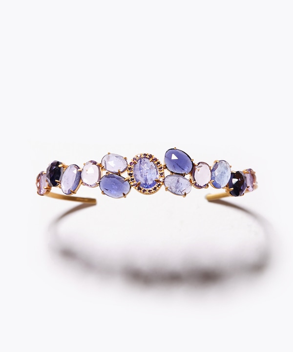 ゴージャスなバングルは、タンザナイト、アイオライト、パヴェのアメジストで取り巻いたタンザナイトをランダムに配置。ベースにはパープルエナメルを入れています。