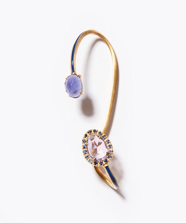 アイオライトを一粒と、ブルーサファイアで取り巻いたアメジストを配したイヤーカフ。ベース部分にはネイビーのエナメルを入れました。