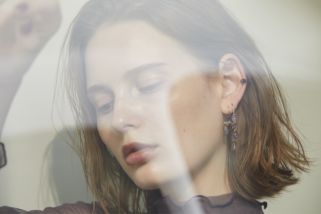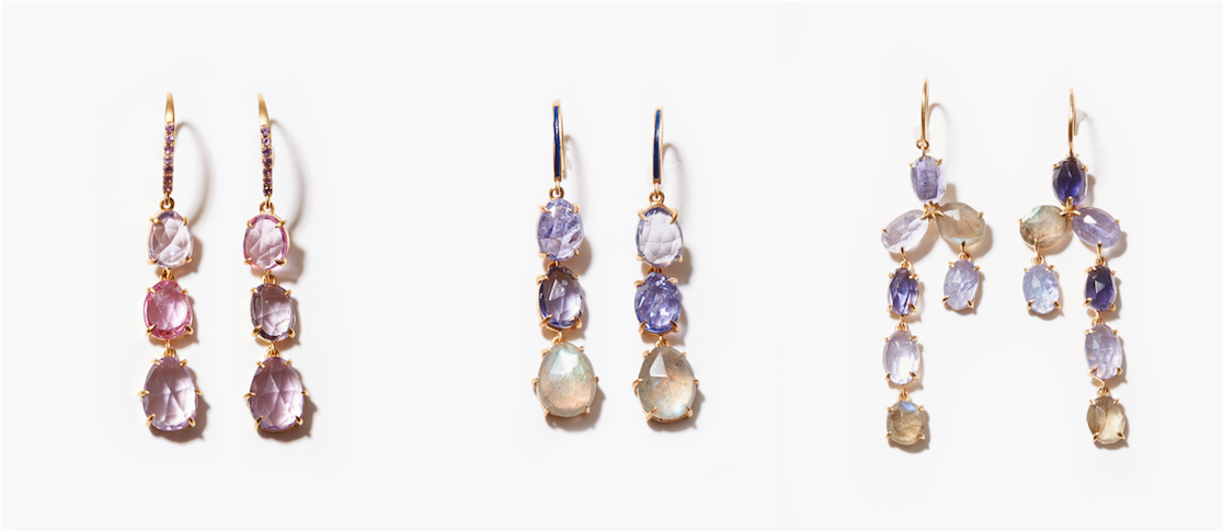 [eutopia] K10 pink and purple sapphire drops pierced earring 66,000yen (with tax) / [eutopia] K10 tanzanite, iolite and labradorite drops pierced earring 66,000yen (with tax) / [eutopia] K10 tanzanite, iolite and labradorite chandelier pierced earring 132,000yen (with tax)