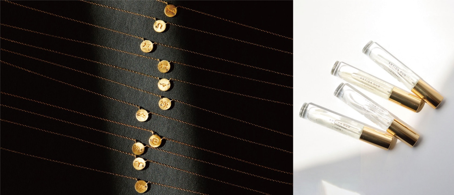 デイリーで身に着けられると人気の、星座サインが入った華奢なコインチャームネックレス。今年のクリスマスは特別に、オリジナルのオーガニックパフュームとのセットもご用意しました。