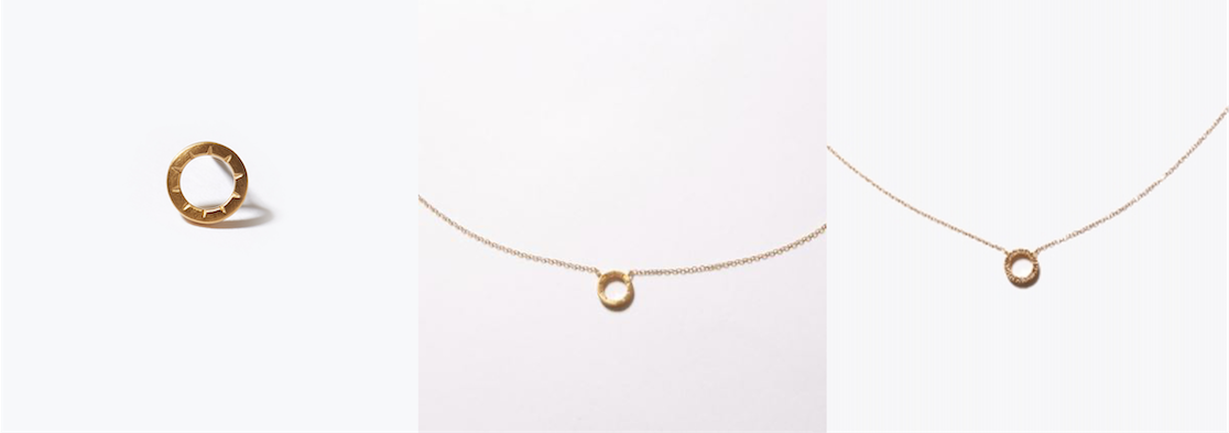 プチサイズのサークルモチーフ。天使の光輪を想わせる10本の飾り彫りを入れました。繊細なスタッドピアスは、さり気ない細工で存在感を放ちます。同じデザインのネックレスと、右側はパヴェダイヤモンドをぎっしり乗せたプチサークルチャームのネックレス。