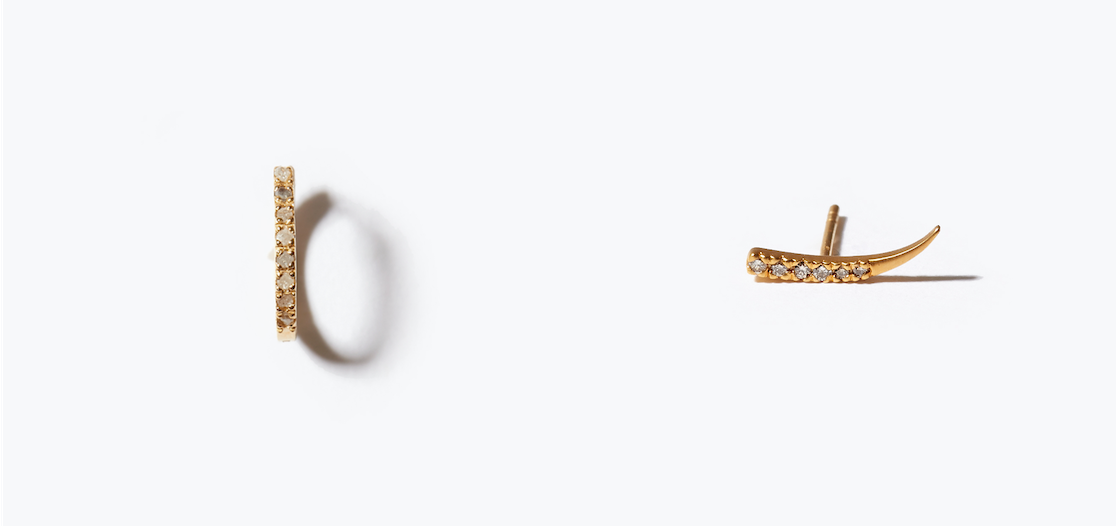 [sirocco] K18 pave diamond mini hoop single pierced earring 38,500yen (with tax) / [sirocco] K18 pave diamond mini horn studs single pierced earring 23,100yen (with tax)