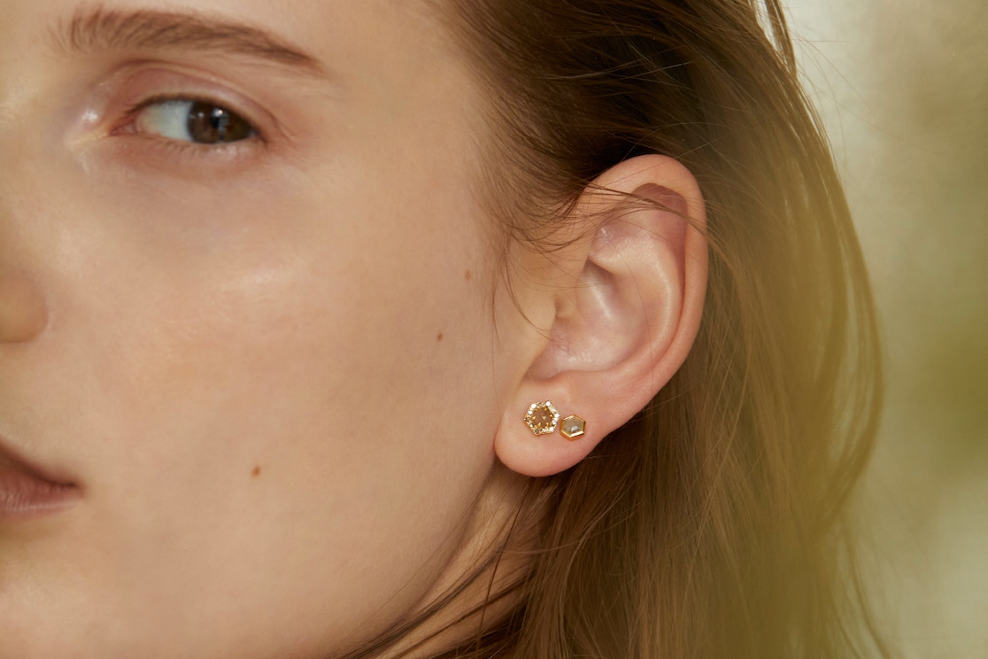 [sirocco] K18 hexagon diamond studs single pierced earring 38,500yen (with tax) / [sirocco] K18 hexagon diamond pave studs single pierced earring 49,500yen (with tax) ※発売日未定