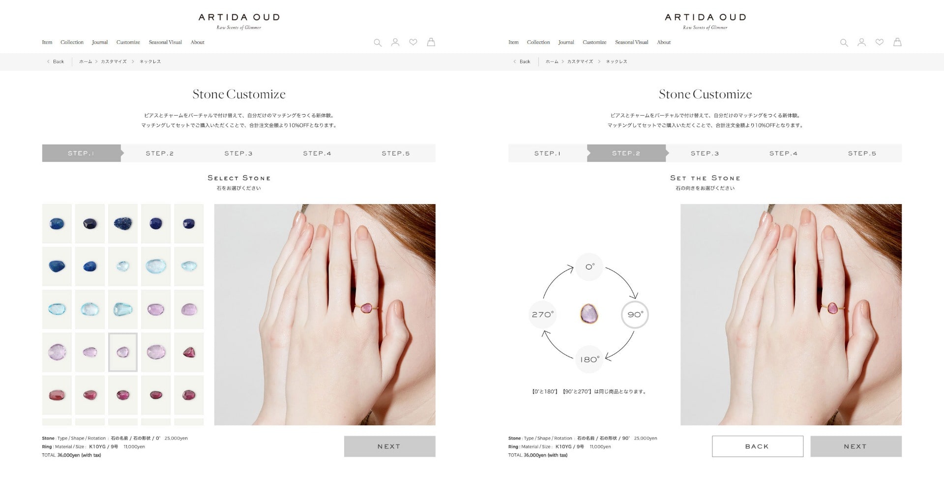 「Stone Customize」には常時30種類ほどある個性的な石の中から、好みのものをセレクトします。種類はもちろん、形状も一つひとつ異なるものの中からお選びいただけます。石を選ぶと手の上で石がリングにセットされ、大きさや色味のイメージを確認しながら、シミュレーション画面で石の向きを90度ごとに変えることも可能。地金は10金と18金から選択し、サイズは3号から13号まで1号きざみでオーダーができるようになっています。