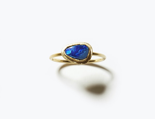 それはまるで、アドリア海の深いブルーのような輝き…大変希少なオーストラリア産のボルダーオパールを、K10YG+K18YG platingで覆輪留めのリングに。石のまわりの独特のテクスチャーが風合いを醸し出します。