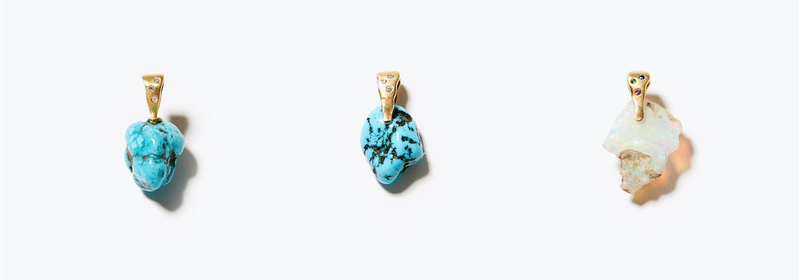 七色の遊色効果を放つ、ホワイトオパールと、ターコイズの中でも希少なスリーピングビューティー。原石をそのまま、K10YG+K18YG platingのチャームに。バチカン部分にパヴェのマルチサファイアやダイヤモンドを埋め込み、彩と煌めきを添えました。