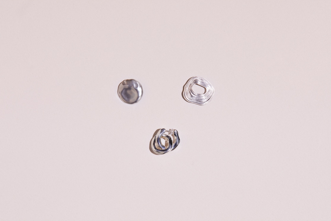 有機的で大胆なフォルム。流れる水のようなピアスとリング。インドの伝統工芸のテクニックを生かしたバングル。ボリュームのあるシルバーをマットに仕上げた、独特の風合いをお楽しみください。