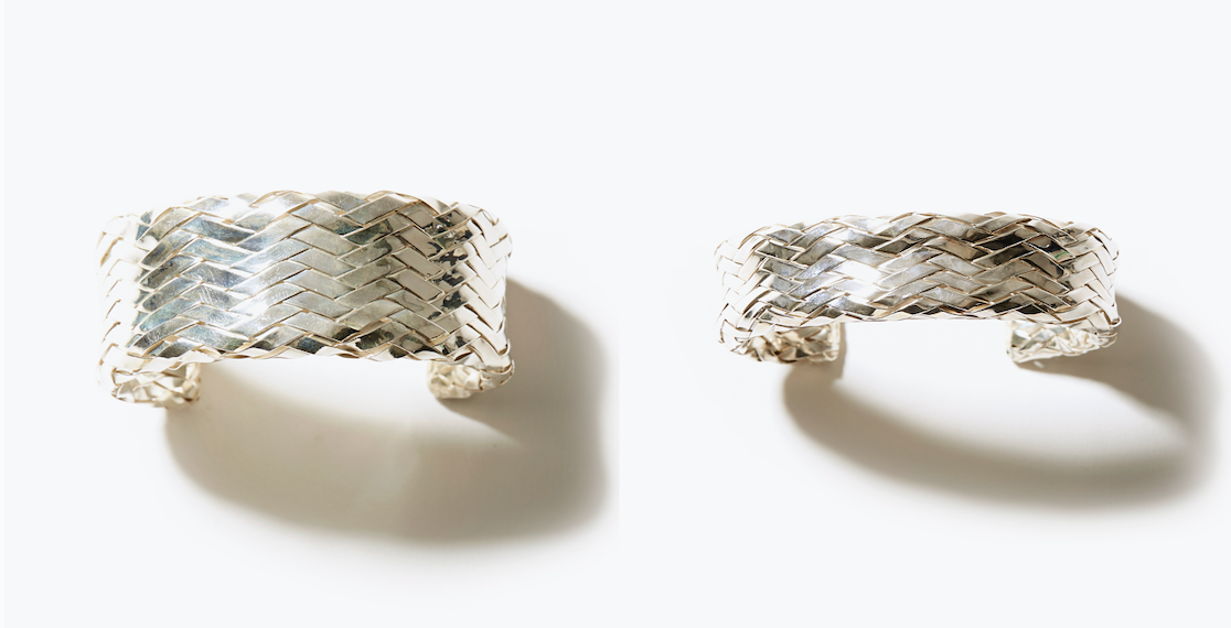 シルバーを帯状の伸ばしたものを編み込むインドの伝統的な技法を使い、ボリュームのあるモダンなバングルに仕上げました。一点一点、熟練の職人が手作業で編み上げた、温かみを感じる逸品。