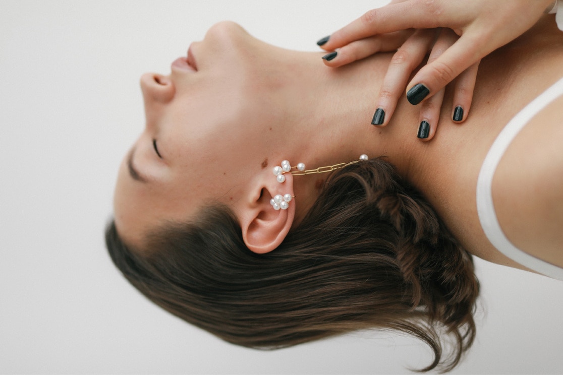 ピアスと同様、大小のパールを5粒配したイヤーカフ。顔周りを印象的に、やわらかく見せてくれます。