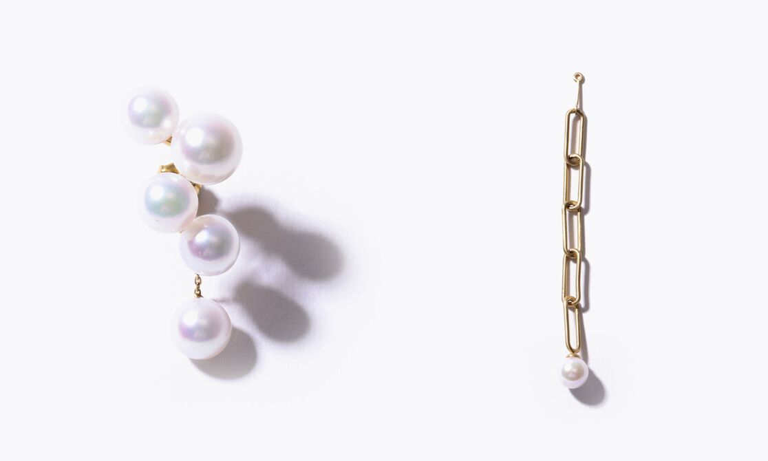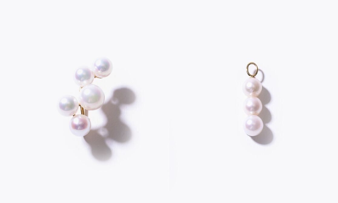 もうひとつは、3粒のパールをミニマルに並べたチャーム。チェーンネックレス、フープピアスに通すのはもちろんのこと、イヤーチャームとしてお使いいただくのもおすすめです。