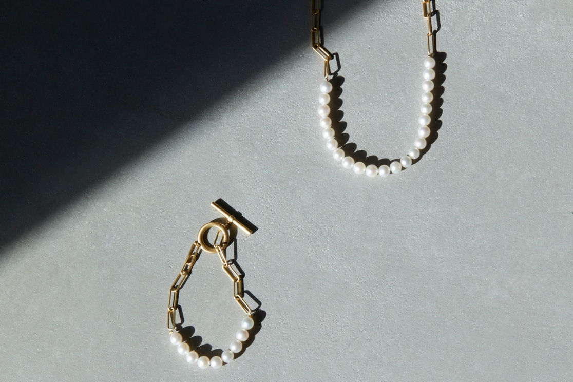 マットな質感がシックな印象を醸すケーブルチェーン。アコヤパールを掛け合わせて、艶やかでモダニティ溢れるムードに仕上げました。