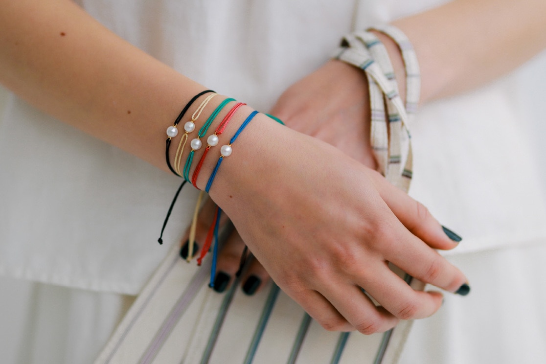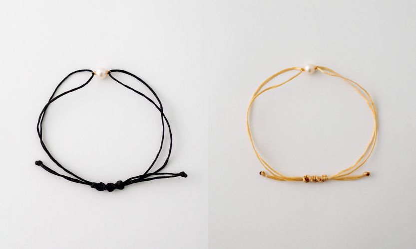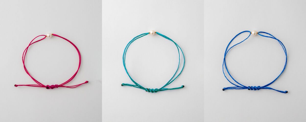 優美な佇まいのアコヤパールを一粒添えた、カラフルなコードブレスレット。