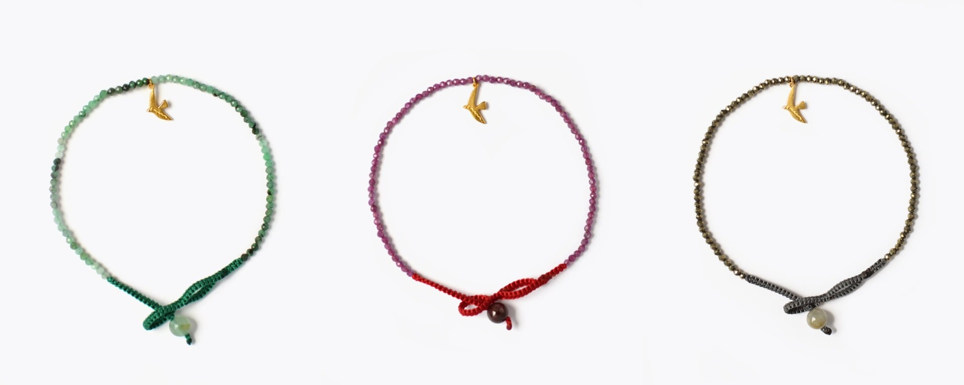 [I am donation] garnet amethyst green onyx leaf choker 6,600yen (with tax) / [I am donation] aquamarine labradorite peridot bird choker 6,600yen (with tax) / [I am donation] pyrite mother of pearl moonstone bird choker 6,600yen (with tax)