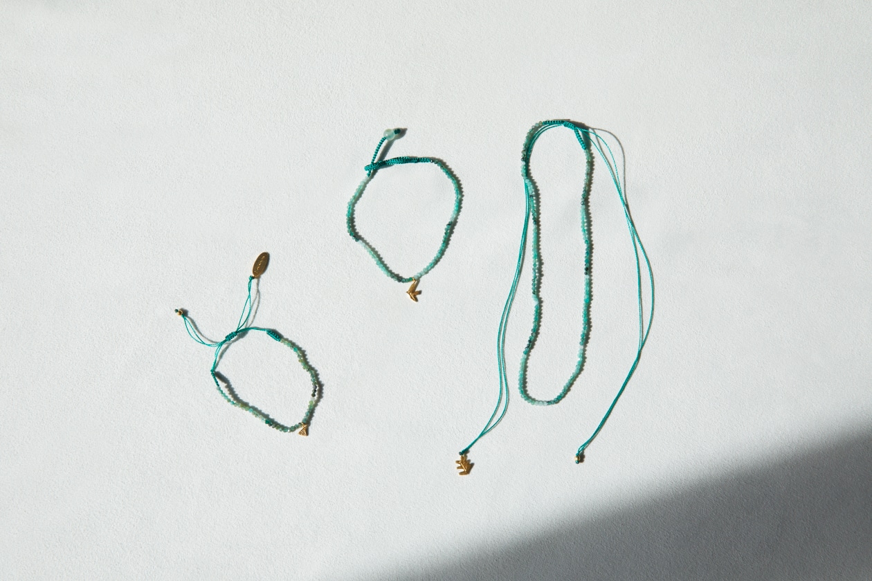opnnerの岩谷さんがこのために描き下ろしてくださった絵柄のチャームを付けたブレスレット、チョーカー、アンクレット。付属するのは、幸福な夏を象徴するかのようなゴールドのタトゥーシール。