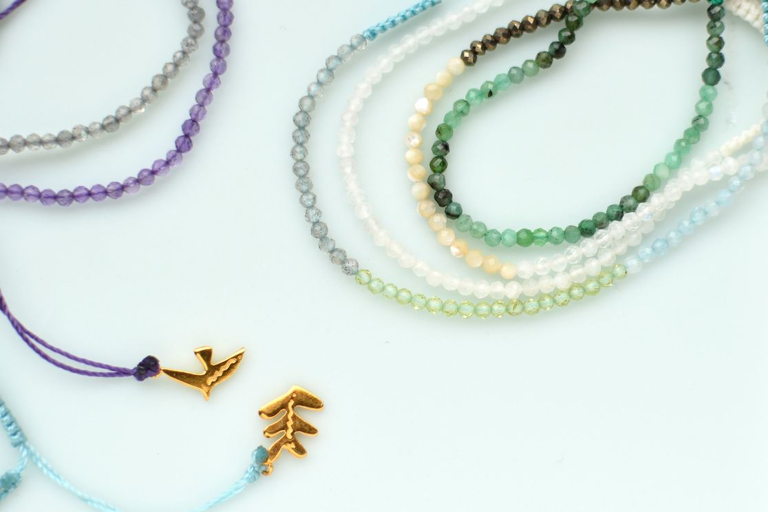 もちろん、ブレスレットも、「鳥」と「葉」の2種のチャームをつけて、ストーンのバリエーションも豊富に揃えました。