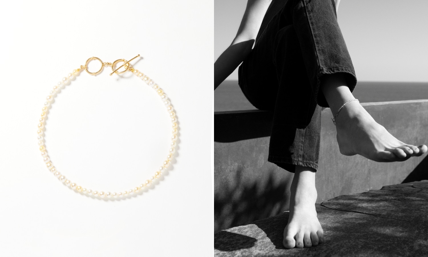 コンサバティブなイメージのパールは、カジュアルに着けるのが今のトレンド。Tシャツに合わせてみたり、チェーンと重ねてみたり。また、これから素足になる季節、パールをアンクレットで取れ入れるのもスタイルがぐっと新鮮でモダンになり、とても素敵ですので、ぜひ挑戦していただきたいアイテムです。