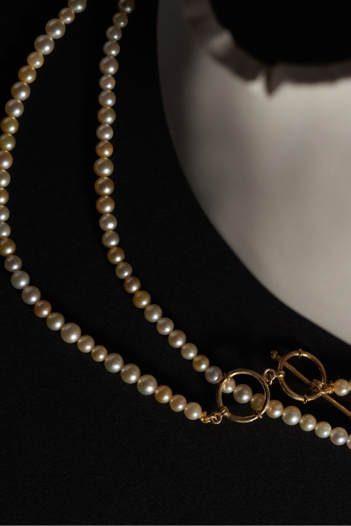 最後にご紹介するのが、ベビーアコヤパールの新作“moon drops”。イエローゴールドがめずらしい、小粒の可憐なベビーパールを連ねたネックレス、チョーカー、アンクレットの3型が登場しました。ネックレスは2連に重ねるとチョーカーに。チョーカーは2連に重ねるとブレスレットにもできる2wayです。金具は、インドで制作したオリジナルの風合いある金具を使用し、細部までこだわっています。