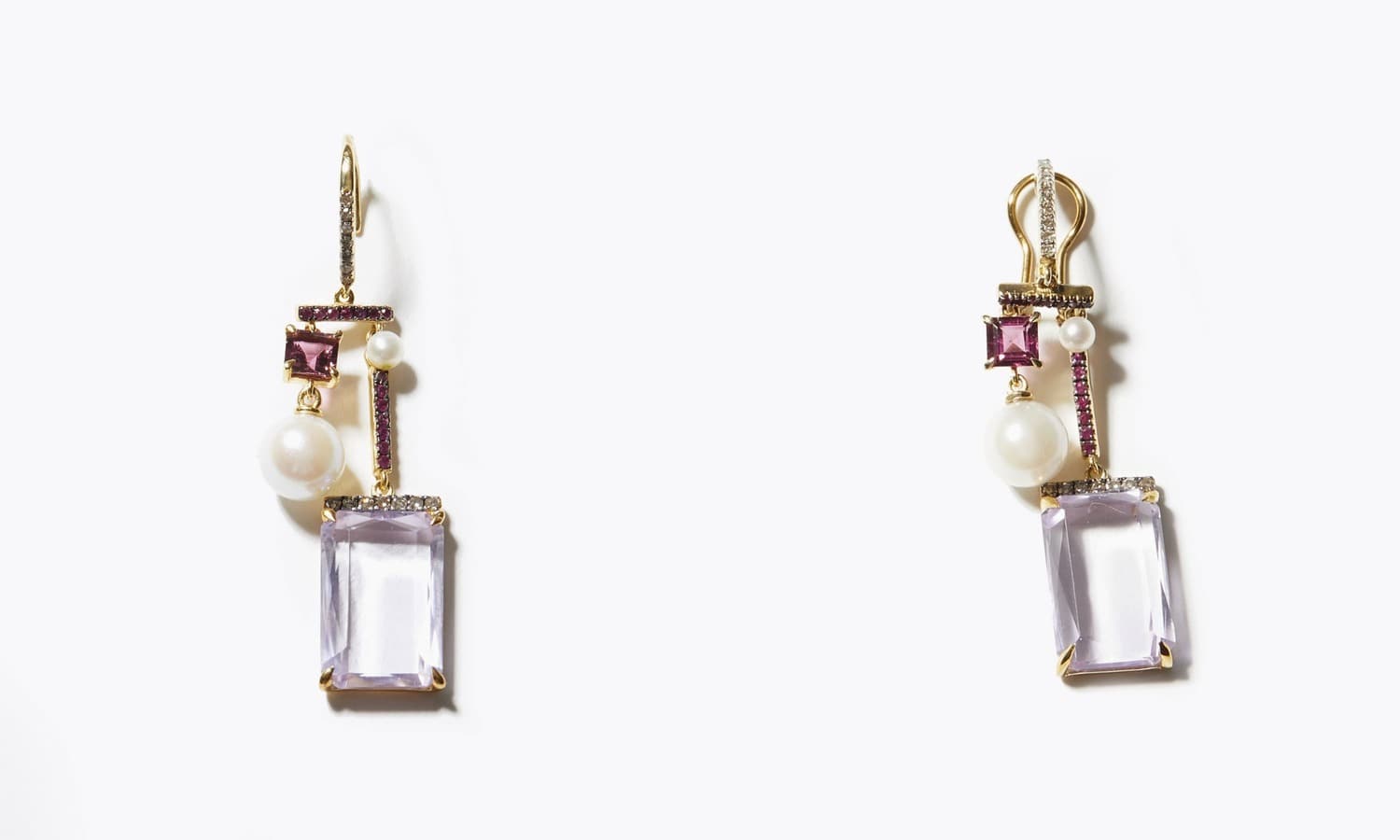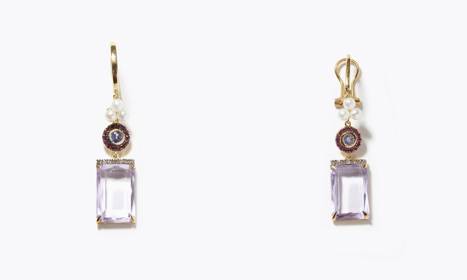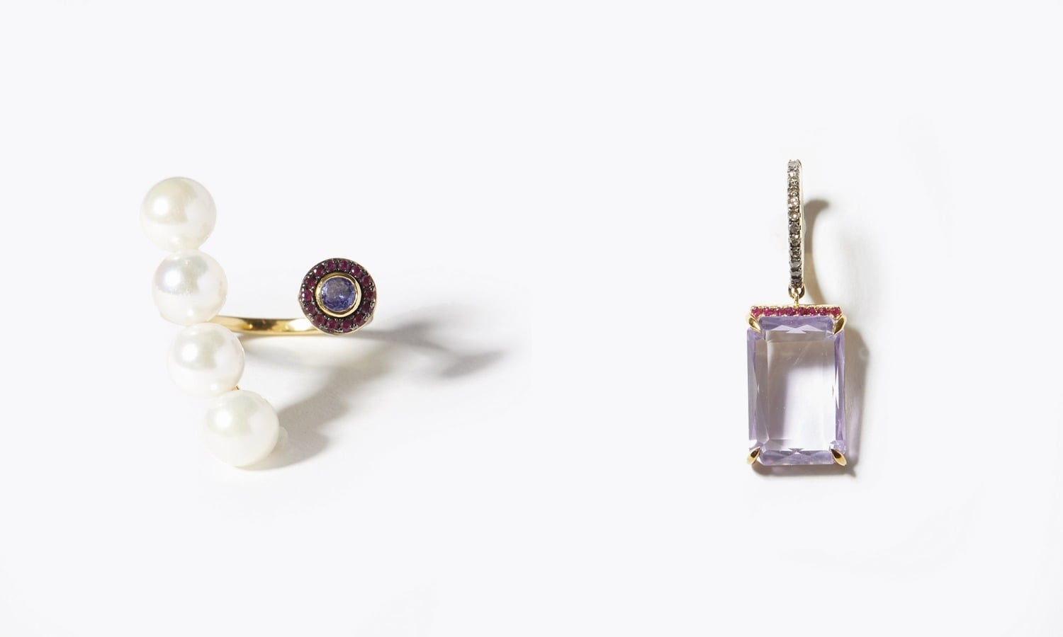 右下は、スクエアカットの透明感溢れるアメジストをパヴェダイヤモンドで象ったイヤーカフに垂らしました。ありそうでなかったカラーストーンをあしらったイヤーカフです。アメジストの一辺にはパヴェのルビーも添え、華やかさをプラスしました。