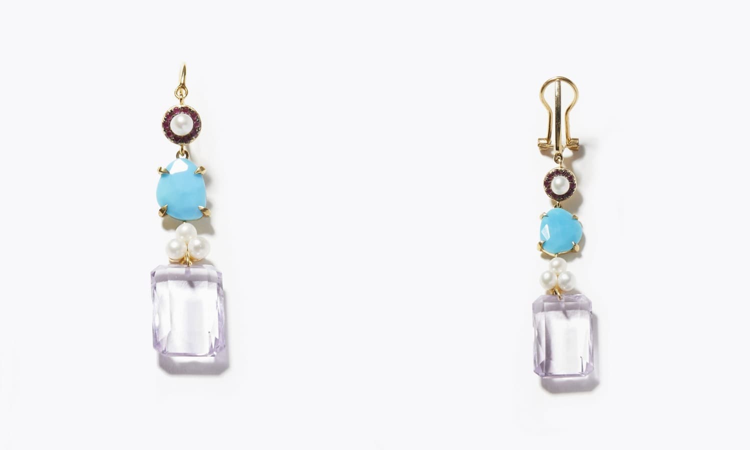 [elafonisi] 【4th Anniversary Limited】 amethyst turquoise ruby single pierced earring 27,500yen (with tax) / [elafonisi] 【4th Anniversary Limited】 amethyst turquoise ruby single ear clip 29,700yen (with tax)