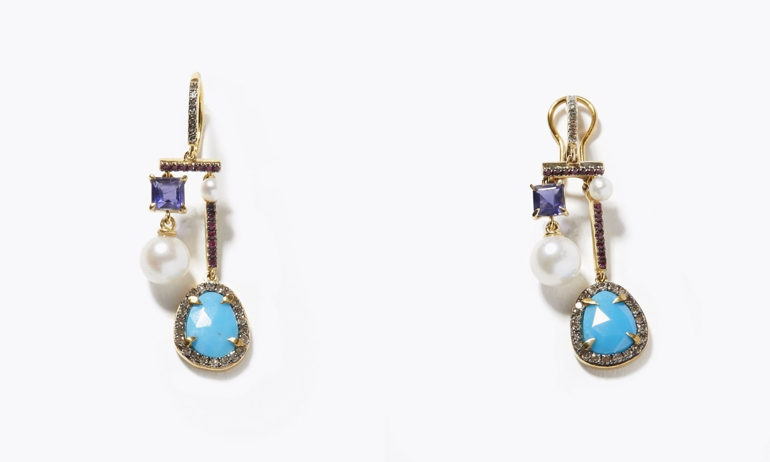 アコヤパールとルビー、ピンクトルマリン、タンザナイト、アイオライトを掛け合わせ、初夏らしい涼やかなシャンデリアピアスとイヤリング、イヤーカフに。